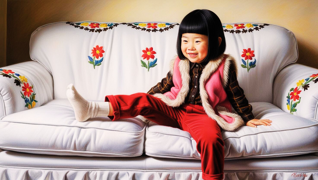 하얀 커버에 알록달록한 꽃들의 자수가 나 있는 소파에 앉아 있다. 귀를 살짝 덮은 커트 머리에 앞머리가 가지런하지만, 옆머리가 살짝 삐죽 나왔다. 앞니를 부끄러운 듯 살짝 드러내며 고개를 돌리며 웃는다. 빨간 바지와 진하지만 밝은 갈색과 검은색 체크 셔츠를 줄곧 입는 아이였다.