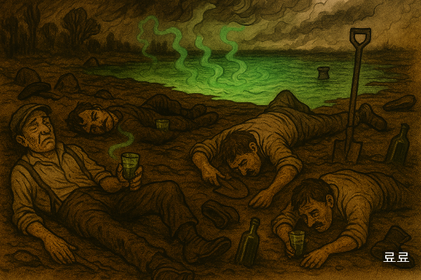 그들은 마치 호수 속에서 뭔가를 끌어올리는 듯, 반복적으로 땅을 긁고, 흙을 뒤집고 있었다. 평범한 삽질이 아니었다. 행동의 목적은 중요하지 않은 것 같았다. 오히려 끝없는 형벌처럼, 의식 없이 반복되는 동작에 가까웠다.