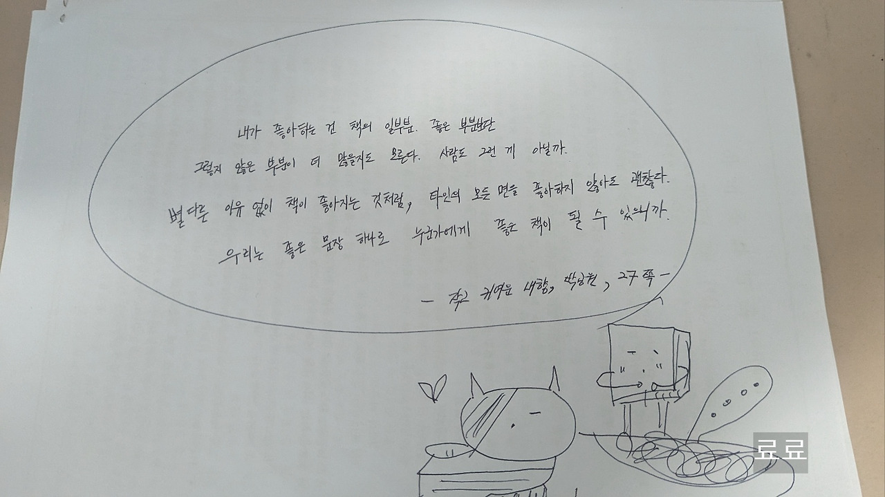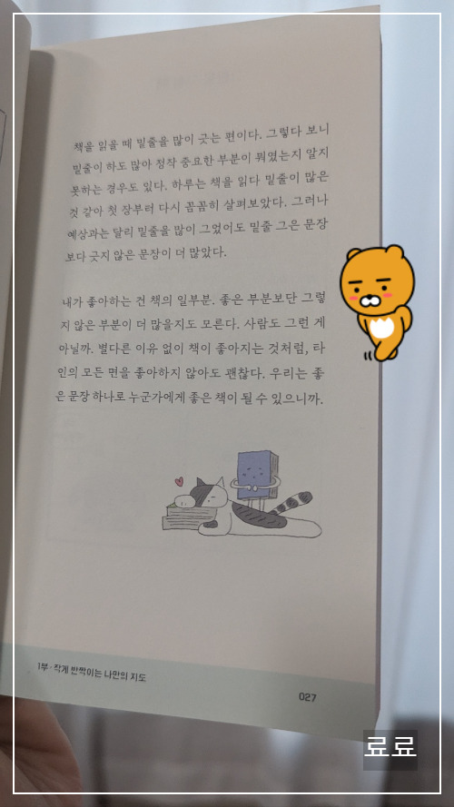 (내가 좋아하는 건 책의 일부분. 좋은 부분보단 그렇지 않은 부분이 더 많을지도 모른다. 사람도 그런 게 아닐까. 별다른 이유 없이 책이 좋아지는 것처럼, 타인의 모든 면을 좋아하지 않아도 괜찮다. 우리는 좋은 문장 하나로 누군가에게 좋은 책이 될 수 있으니까.) - 27쪽