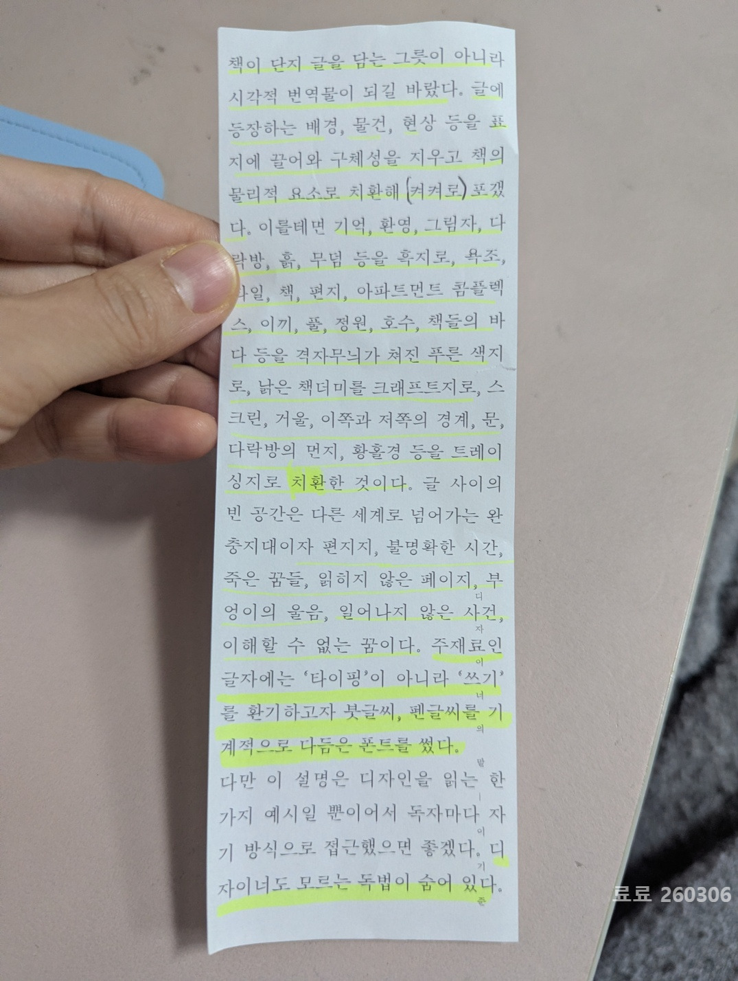 책을 들고 페이지를 차르르 넘기던 순간 쪽지 하나가 떨어졌다. <디자이너의 말 - 이기준>이라는 긴 쪽지였다.