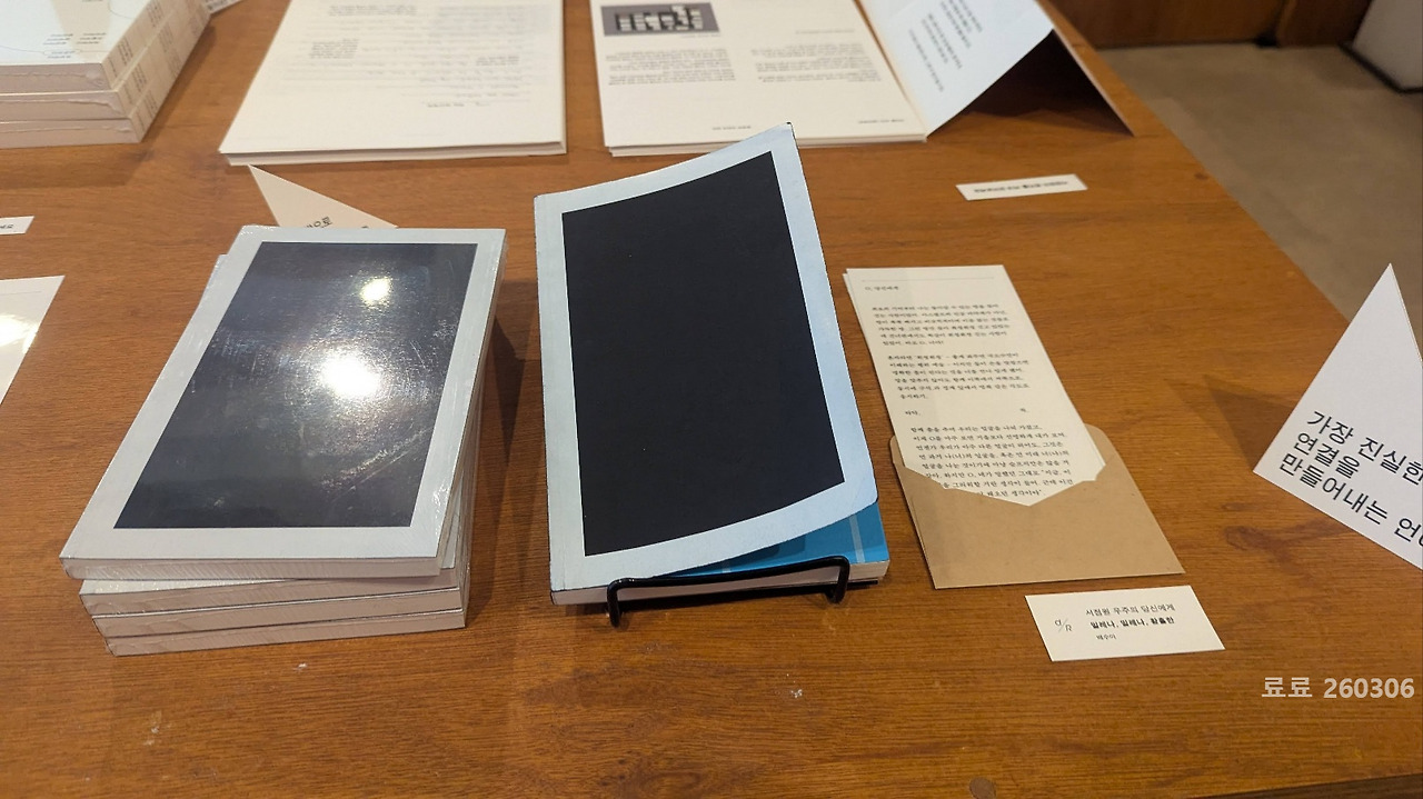 경직된 몸짓으로 주위를 돌아보다가 1층 나무 테이블 위에 몇 권의 책이 놓여 있는 것을 발견했다. 그중 검은 표지의 책 한 권이 눈에 들어왔다. 마치 사람의 손을 기다리지 않아도 이미 그 자리에 완성된 하나의 존재처럼 놓여 있었다.