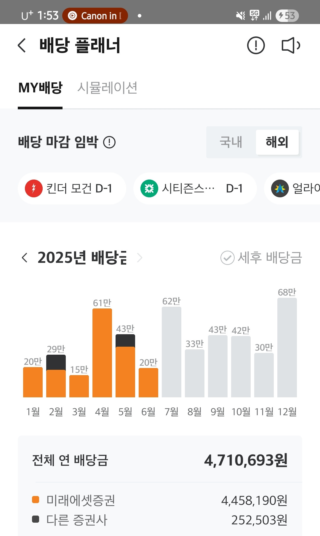 아래 올해 받을 제 배당금을 공유하며 글을 마치겠습니다. 내년에는 600만 원이 넘었으면 좋겠습니다:)