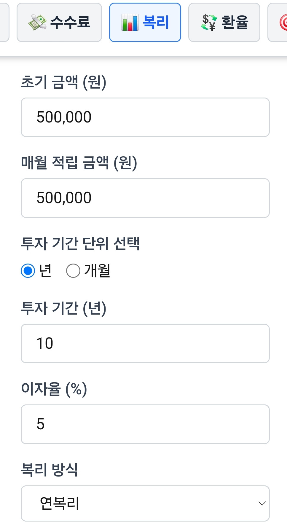 매달 50만 원씩 5%의 연복리로 투자한다면 어떤 결과가 나오는지 보겠습니다. 간단한 복리계산기를 활용한 결과입니다.