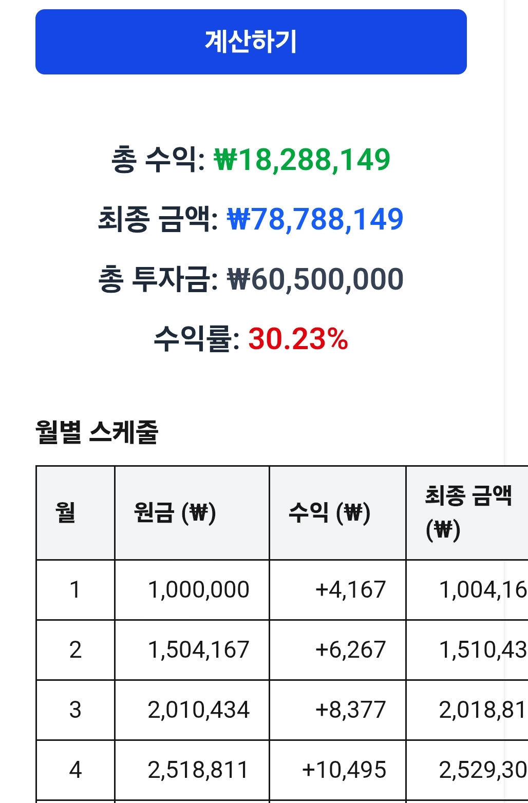 위 결과를 보다 보면 수익률보다 중요한 것은 결국 내 자본의 크기입니다. 저축을 만약 10만 원 밖에 하지 못했다면 5분의 1로 줄어든 1580만 원만 얻었을 겁니다.