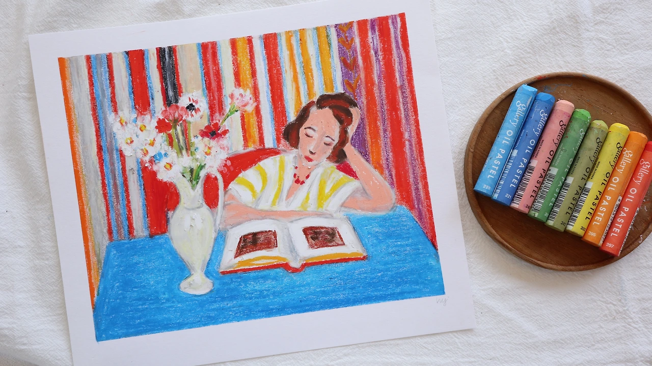그림 속 여인은 밝고 경쾌한 색들 속에 둘러싸여 있지만 차분하게 한 손으로 머리를 받치며 평온한 표정으로 책을 읽고 있다.