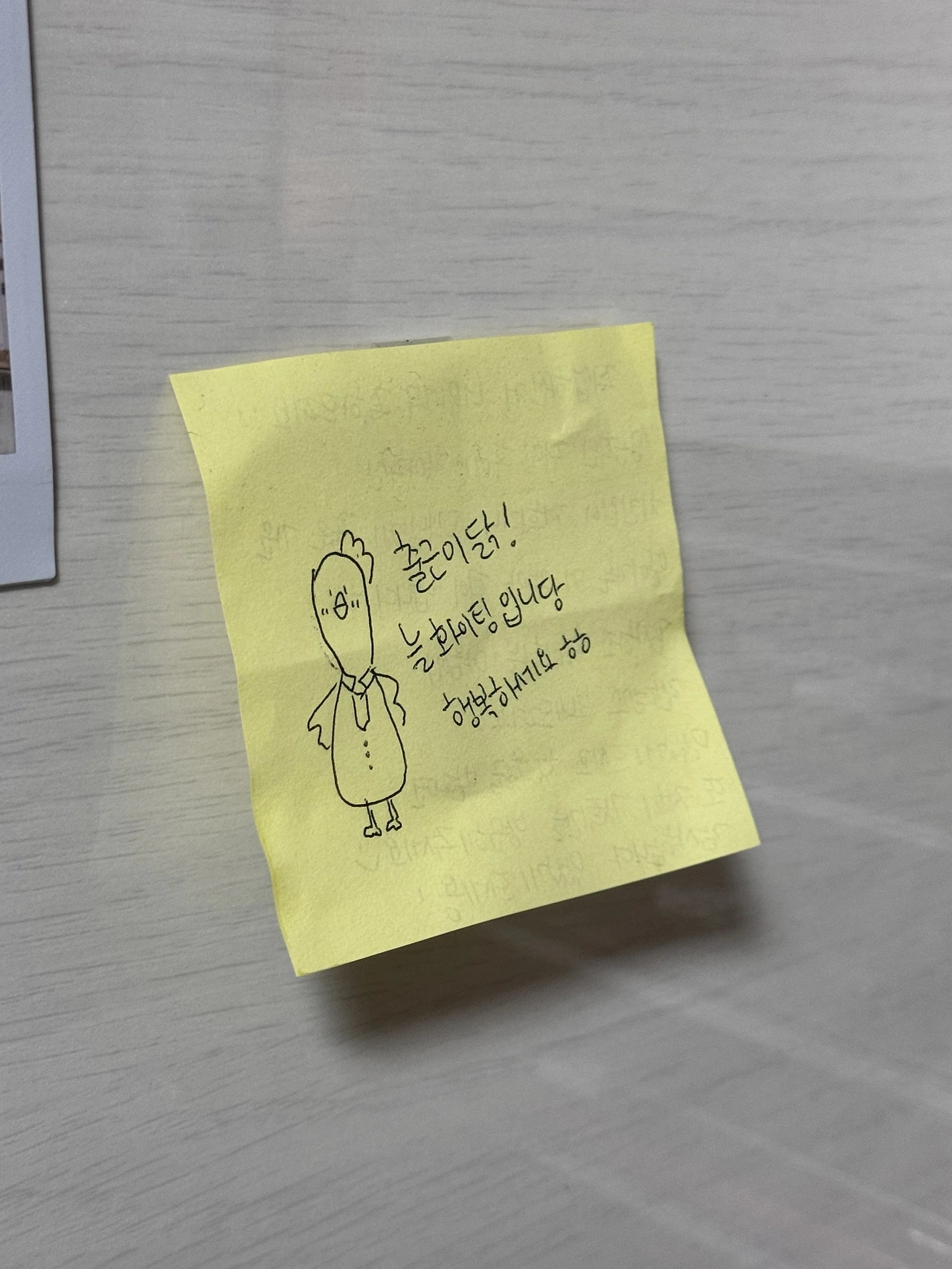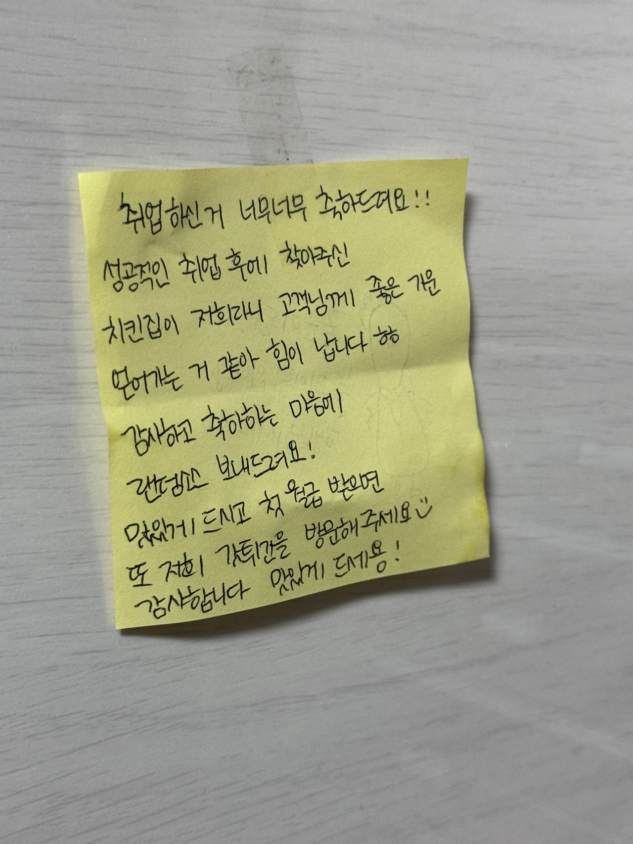신나는 마음에 '저 취업했어요!!' 라며 좋은 에너지를 가져가라고 사장님께 전하는 메세지를 남겼었다. 그리고 치킨에는 하나의 포스트잇이 붙어 도착했다.