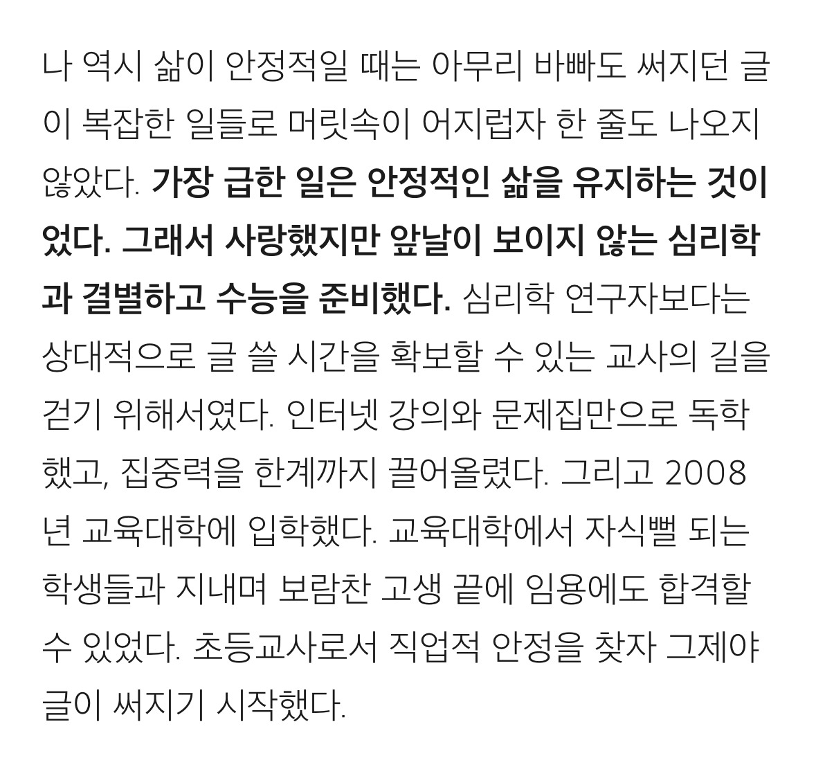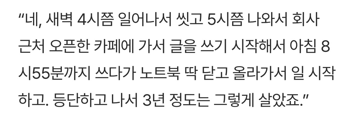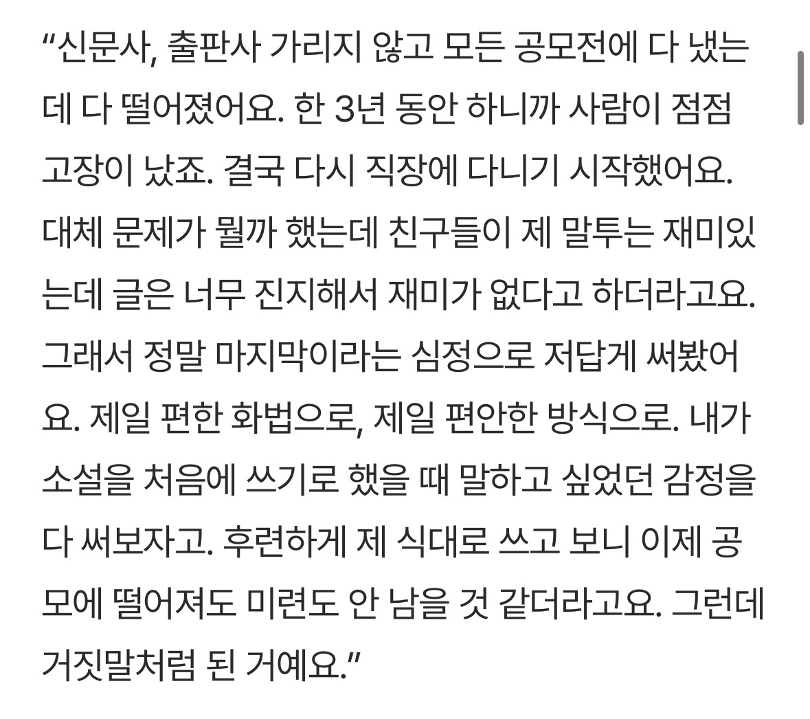 내가 이직을 안 한 이유는 먹고 사는 일 외에 남는 시간과 에너지를 전부 창작에 쏟기 위해서였다. 책을 만들면서 느꼈다. 나한테 중요한 건 돈이나 명예보다 창작 그 자체라는 것을.. 레퍼런스를 모아서 이직하려고 인터뷰를 하러 다녔는데 막상 인터뷰 자체에 빠져버렸다.앞으로 인터뷰, 독립출판, 글쓰기를 하면서 살아야겠다고 결심했다.