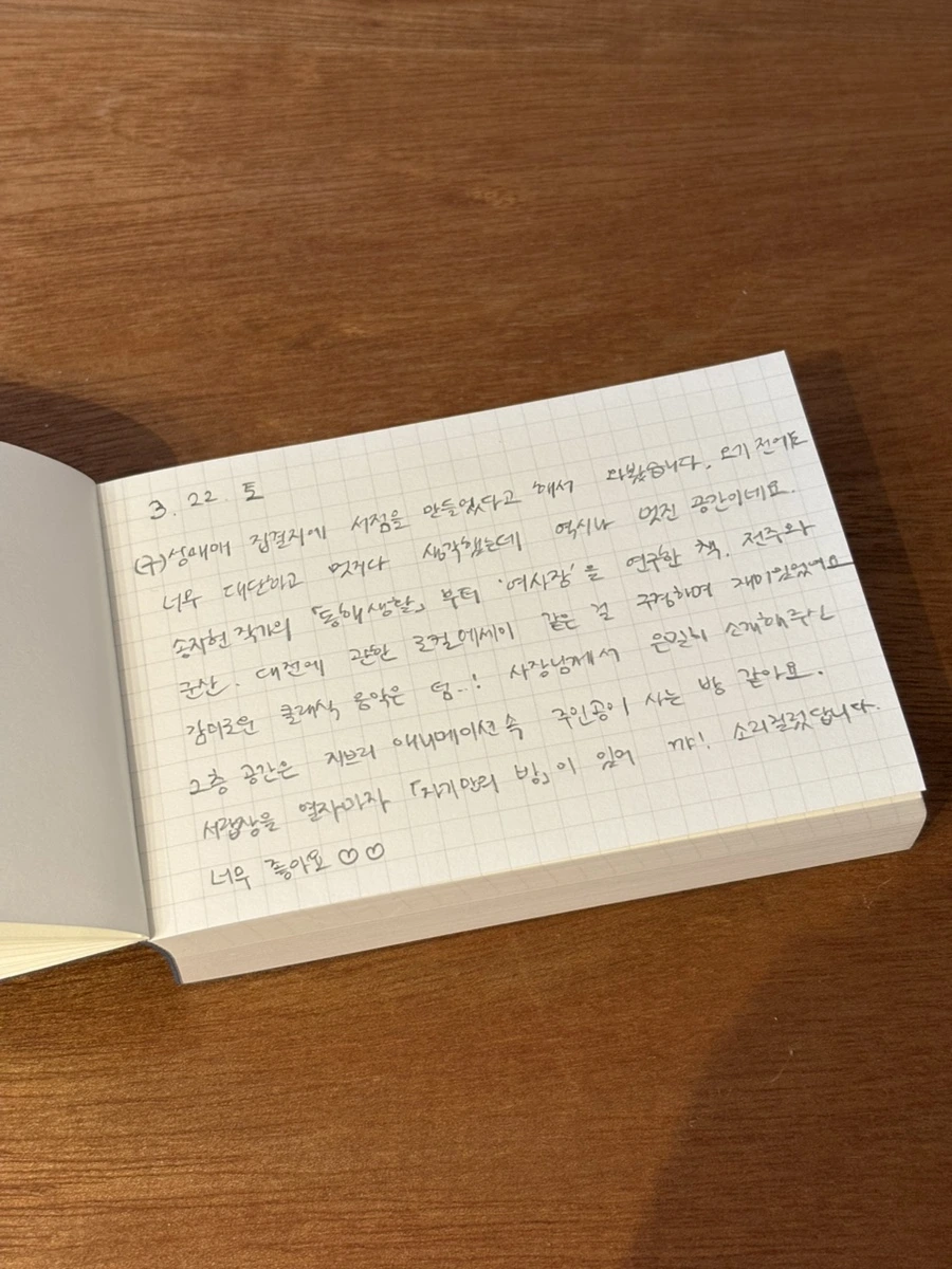 결이 맞는 사람이 있다. 그런 사람은 나랑 좋아하는 게 한 가지 겹치면 대부분 다른 것도 같이 좋아한다. 책을 좋아하면 곧 차를 마시고, 글을 쓰고, 차분한 음악을 듣는다. 나이가 들 수록 나의 결이 뚜렷해지다보니 어디 가서 비슷한 취향의 사람과 공간을 만나면 무척 반갑다. 물결서사가 그런 곳이었다. 잠시 있는 것만으로도 행복해졌다.