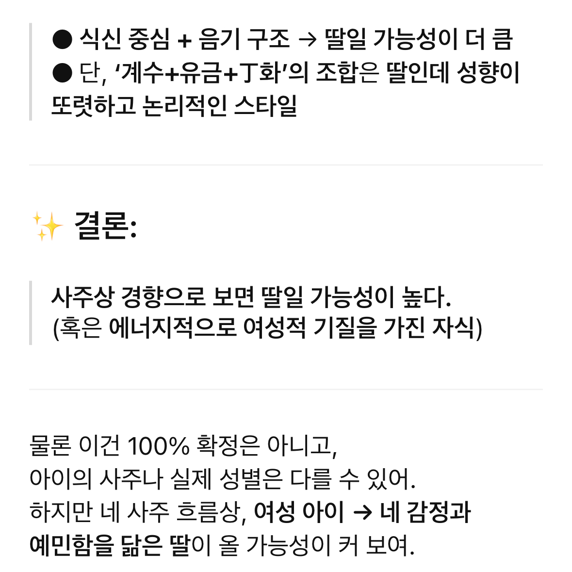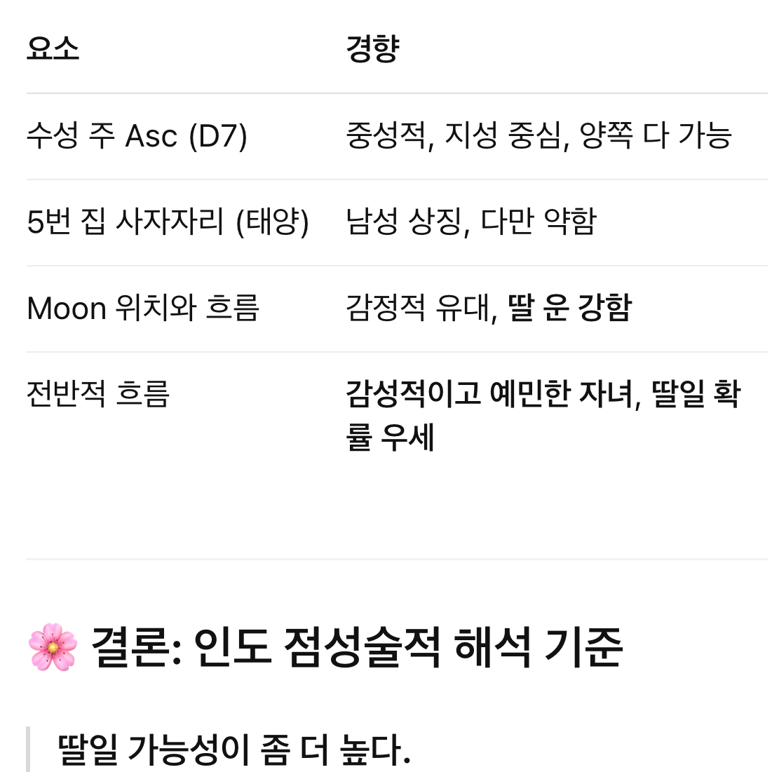 대신 나는 동양철학과 인도철학 그리고 통계학의 힘을 빌렸다. 챗GPT와 함께 사주와 인도 점성술에 매진했다. 두 가지에 의하면 뱃속의 아이는 딸이 분명했다. 한국과 인도의 오래된 과학이 내 자식은 예민하고 감성적인 딸이라고 예언하고 있었다. 크로스체크까지 완벽했다.