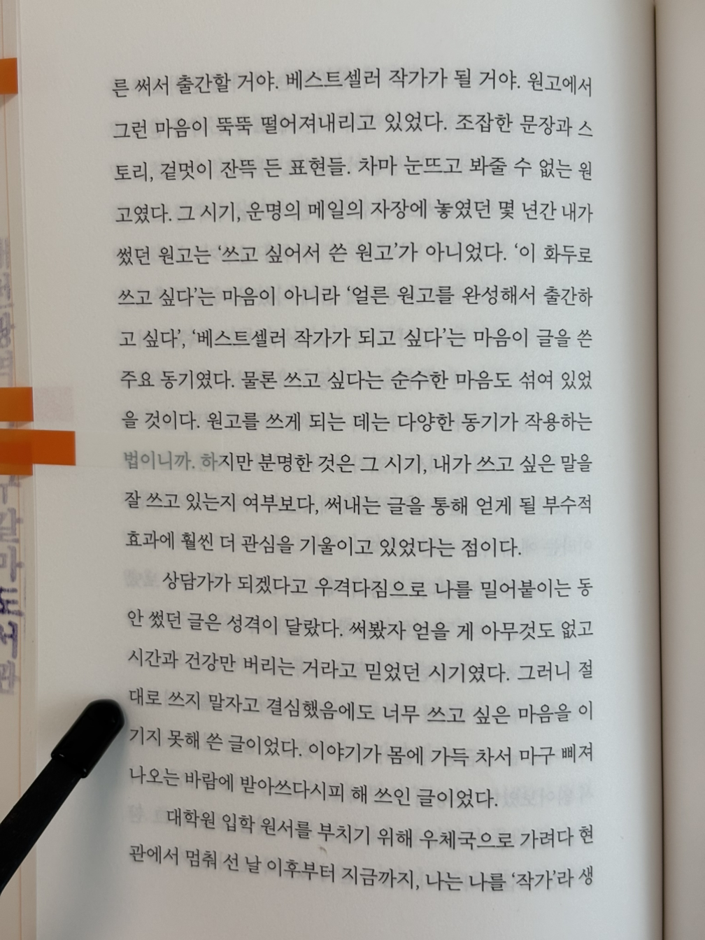 그제야 알았다. 나는 원래 그런 사람이라는 사실을. 그것이 나의 성향, 나의 본질, 그리고 빌어먹을, 나의 운명이라는 사실을. 글쓰기를 통해 잘나갈 수 있든, 그렇지 못하든, 나는 언제나 글을 쓰고 싶어하는 인간이었다. 출판이 되든 되지 않든, 베스트셀러가 되든 되지 않든, 사회적 인정을 받든 못 받든, 나는 감각하고 경험한 모든 것을 부지런히 글로 옮기도록 코딩된 그런 생물이었다.