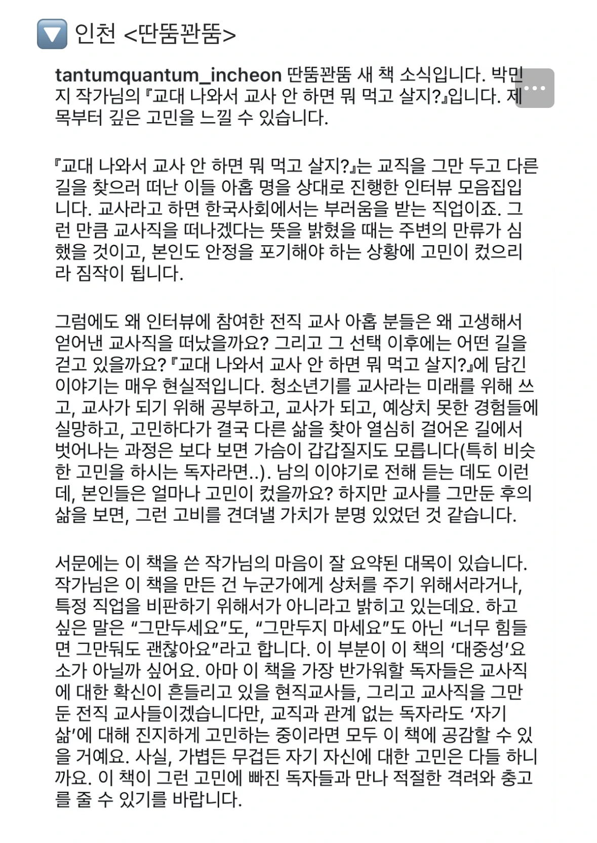 <교대 나와서 교사 안 하면 뭐 먹고살지?>는 5년차 초등교사인 제가 직접 겪은 진로고민에서 출발한 입터뷰집입니다. 교대 졸업 후 다른 진로를 선택했거나, 교사를 하다가 그만둔 (구)동료 9명과의 대화를 통해 나만의 삶과 새로운 길을 찾는 이야기를 담았습니다.