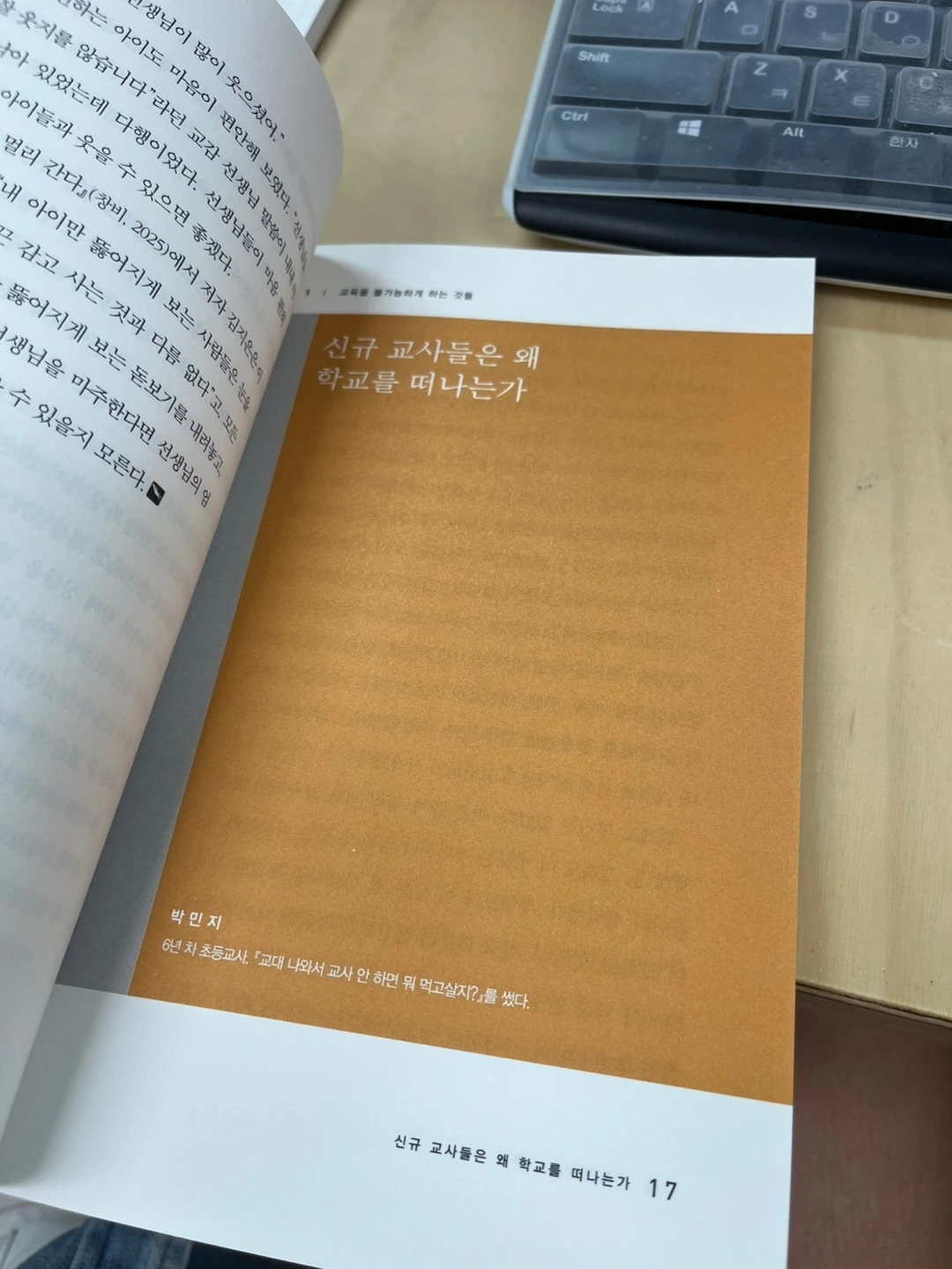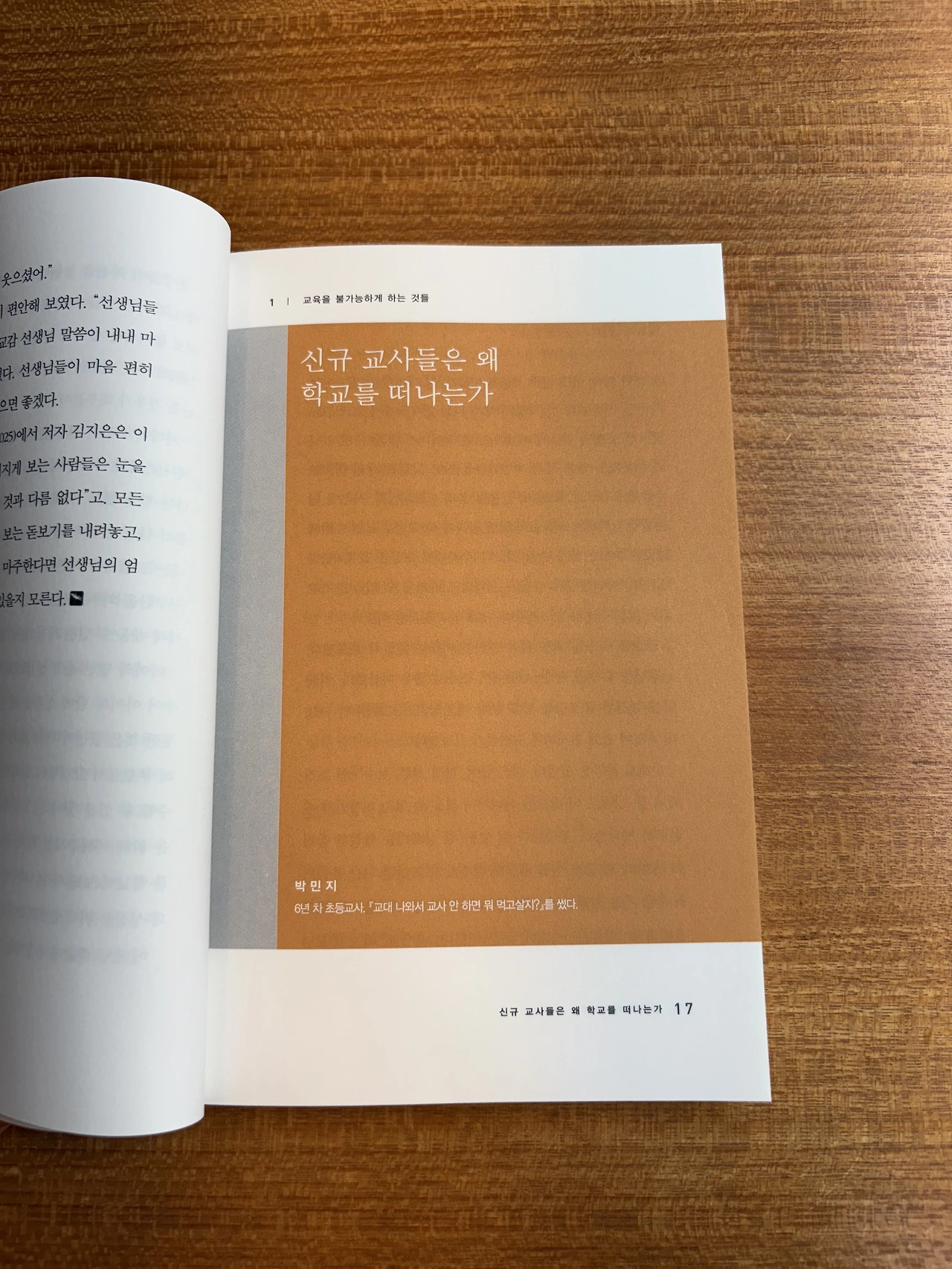 감정을 추스릴 새도 없이 연이어 비슷한 일이 보도됐다. 동료 선생님들이 서울, 군산, 대전에서 스스로 생을 마감했다. 역시 악성 민원과 불공정한 업무 분장 때문이었다. 그때부터 나는 내 직업에 관해 진지하게 고민하기 시작했다. 원래도 불만은 있었다. 적은 급여, 겸직 제한, 보수적인 조직 체계 등. 그래도 이 정도는 어디서나 겪을 수 있는 직장인의 애환 정도라 생각했다.