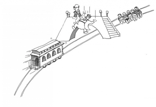 결정자는 레버를 당겨서 좌회전을 할 지에 대해 결정하게 되는데 여기서 레버를 당기면 이 상황에 대해 개입함을 공식적으로 인정하는 것이라고 볼 수 있다. 쉽게 말해서 레버를 당기지 않았다면 이런 불가피한 상황에서 자신의 개입 없이 자연의 뜻대로 어쩔 수 없이 일어난 참사가 되겠지만 레버를 당긴다면 나 '때문에' 자신의 개입이 없었더라면 죽지 않았을 누군가가 죽게 되었다는 것이다. 많은 이들이 현실적으로 다섯 명을 구하는 게 맞다고 생각한다. 그러나 자신의 공식적인 개입에 대한 죄책감 등을 고려하면 선택이 생각보다 쉽지 않다. 이게 잘 와닿지 않고 당연히 다섯 명을 구할 것이라고 생각하는 사람들은 이 경우를 생각해 보라.