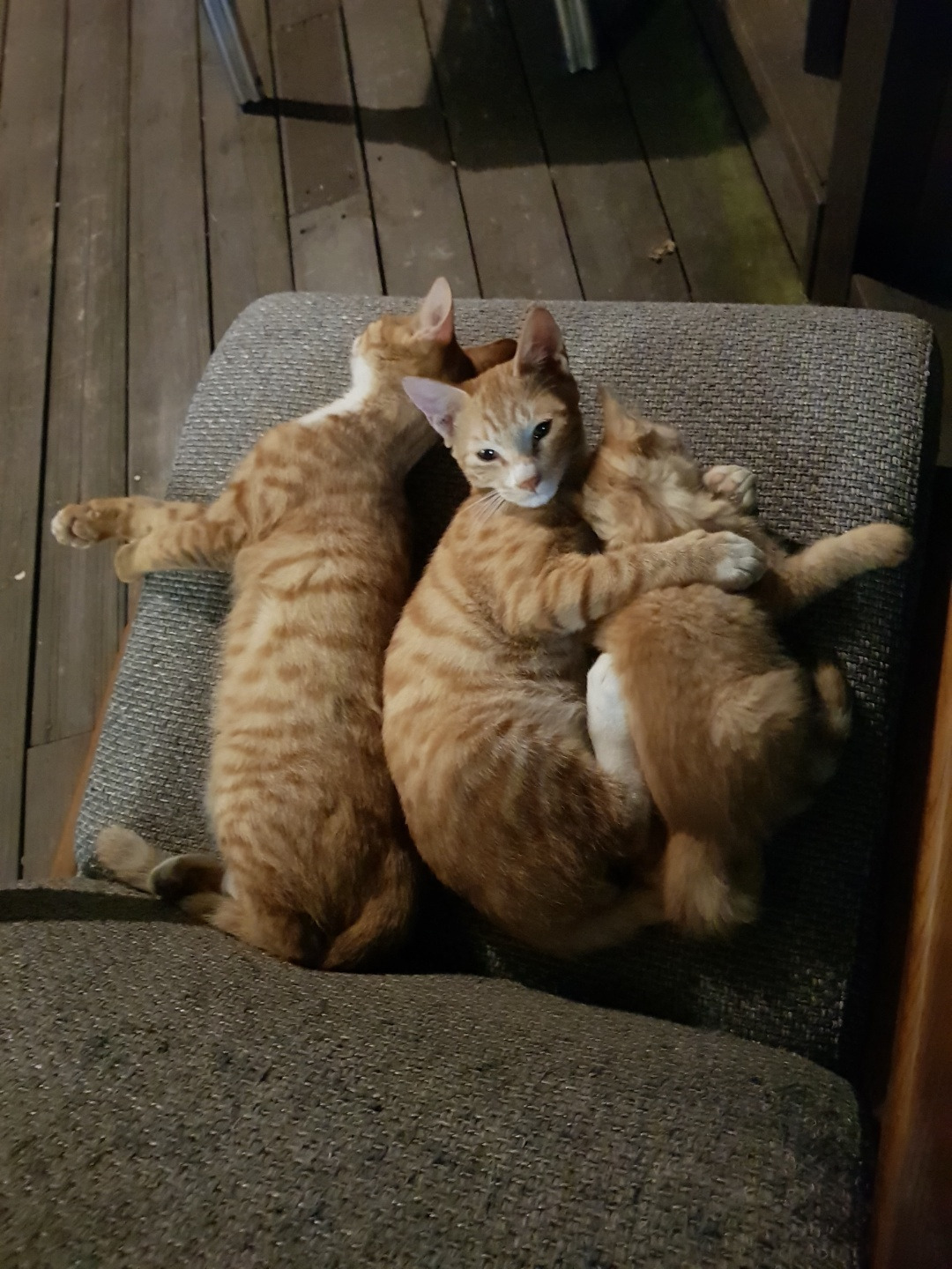 만약 이방인이 노랭이의 심기를 불편하게 한다거나, 한발이나 양발이와 싸우고 동생들을 괴롭혔다면 나는 가차 없이 쫓아냈을 것이다. 그러나 이방인은 모자라 보이는 외모와 달리 아주 지혜로운 편이었다. 생존의 기술을 알고 있다고 할까? 일단 눈치가 빨랐다. 밥을 먹어도 맨 나중에 먹고, 비가 와도 집 안에 들어가려고 하지 않았다. 또 한발이, 양발이와 함께 동생 육아 전선에 적극적으로 합류했다. 동생들 그루밍부터 시작해, 한참 걸음마를 떼고 쫄랑쫄랑 다니는 동생들을 따라다니며 보디가드를 섰다. 여름이라 모기를 비롯해 벌레가 많았는데 동생들 주변에 날아올라치면 얼른 쫓아주거나 잡아먹었다. 잘 때는 마치 첨부터 자기 동생이었던 것처럼 두 발로 꽉 안고 잤다. 신기한 건 동생들도 거부감 전혀 없이 이방인에게 폭 안겨 있다는 것이다. 진짜 핏줄인가 의심스럽기도 했으나, 그건 별로 중요한 게 아니었다.