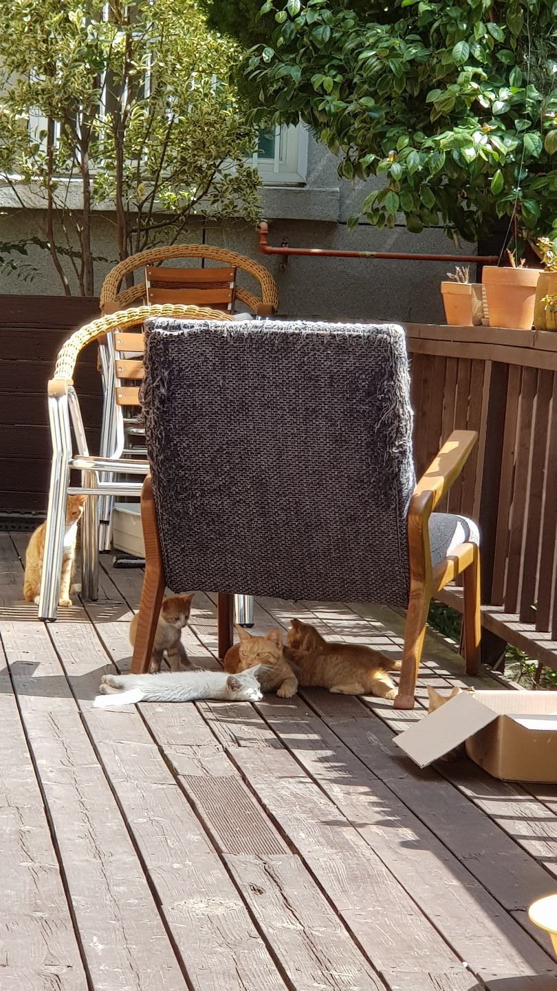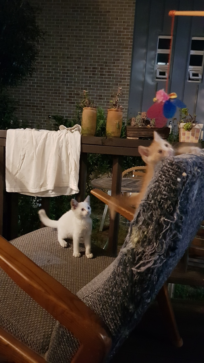 그건 그렇고, 또 이름을 지어줘 버렸다. ‘흰둥이’ 또한 이방인처럼 떠나지 않고 노랭이 가족과 섞여 살기 시작했다. 흰둥이는 야생성이 살아있었다. 나를 보면 하악질을 하기 일쑤고(내 집인데....) 약이라도 발라주고 싶어 손을 뻗으면 자비 없이 할퀴었다. 하아.... 아프질 말던가....