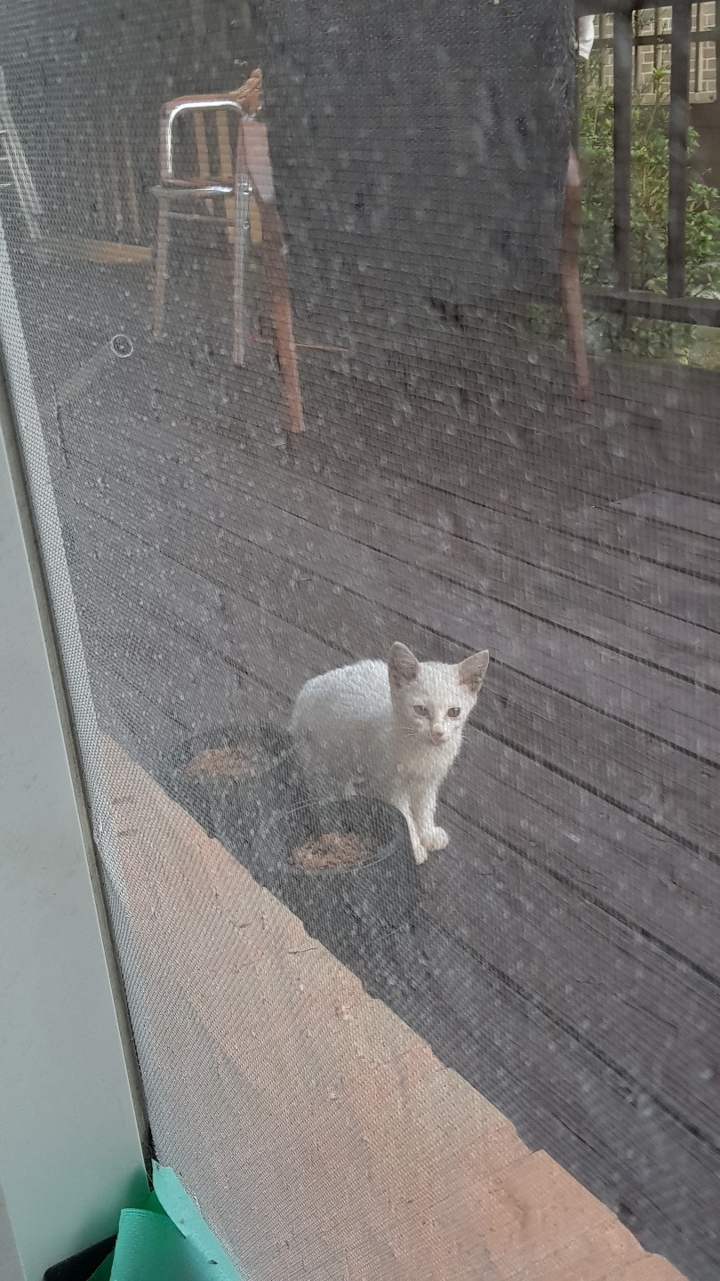 문제는 이방인의 인싸력이다. 이 녀석이 온 이후로 못 보던 고양이들이 눈에 띄기 시작했다. 동네에서 부모 잃은 고양이 연합 회장직이라도 맡았던 것인지, 우리 마당을 기웃대는 녀석들이 늘어났다. 보통 청소년쯤 되는 애들이었는데, 와서 잠깐 밥 먹고 가거나 이방인, 한발이, 양발이와 놀다 갔다. 딱히 신경 쓰고 있지는 않았는데, 어느 날 창밖을 보는데, 또 뭔가 이질감이.... 자세히 보니 하얀 녀석 하나가 노랭이 젖을 먹고 있었다. 동네에 흰색 페르시안으로 보이는 녀석이 종종 돌아다니곤 하는데 그 녀석 새끼인지 아닌지는 몰라도 온몸이 흰 단모 고양이였다. 아직 2개월도 안 된 완전 아깽이였는데 눈곱이 낀 눈에 피부 곰팡이까지 상태가 좋아 보이지 않았다. 그래서일까. 노랭이는 자기 새끼들 사이에 섞여 젖을 먹는 흰둥이를 내버려 두었다.