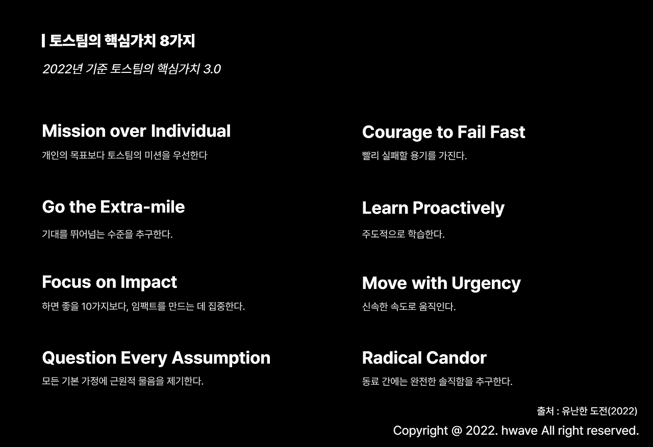 토스팀을 하나로 뭉치게 하는 데에는 그 중심축이 있다. 바로 토스 핵심가치(Core Value)로, 팀과 개인이 탁월한 성과를 내기 위해 일하는 방식을 뜻한다. 토스 팀원들은 이 가치를 지키며 일할 때 더 좋은 성과를 내고 동료의 인정을 받는다. 또한 토스는 이 핵심가치를 통해 혁신을 지속하며 시장에서 승리를 거둔다. (p.100-103)
