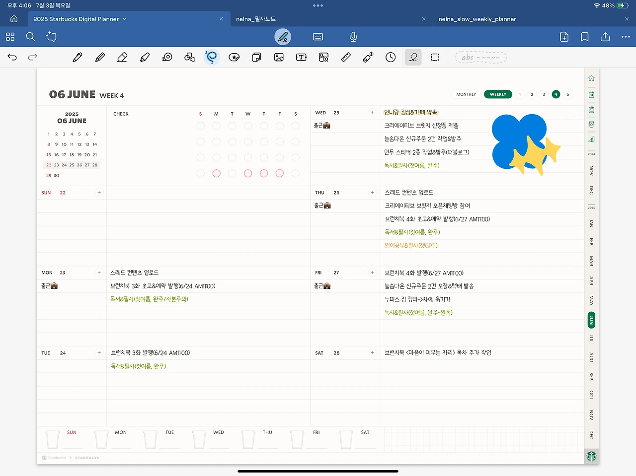 스타벅스 다이어리는 “오늘 하루만 잘해보자”며 말을 건네는 노트다. 데일리 타임라인 기능만 일정 확인용으로 쓰고 있지만, 그 기능 하나만으로도 다시 펼치고 싶게 만드는 매력이 있다.