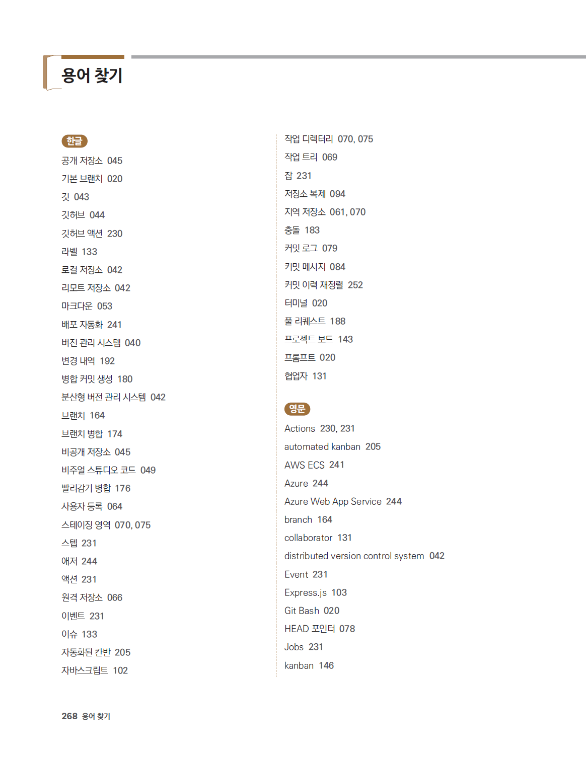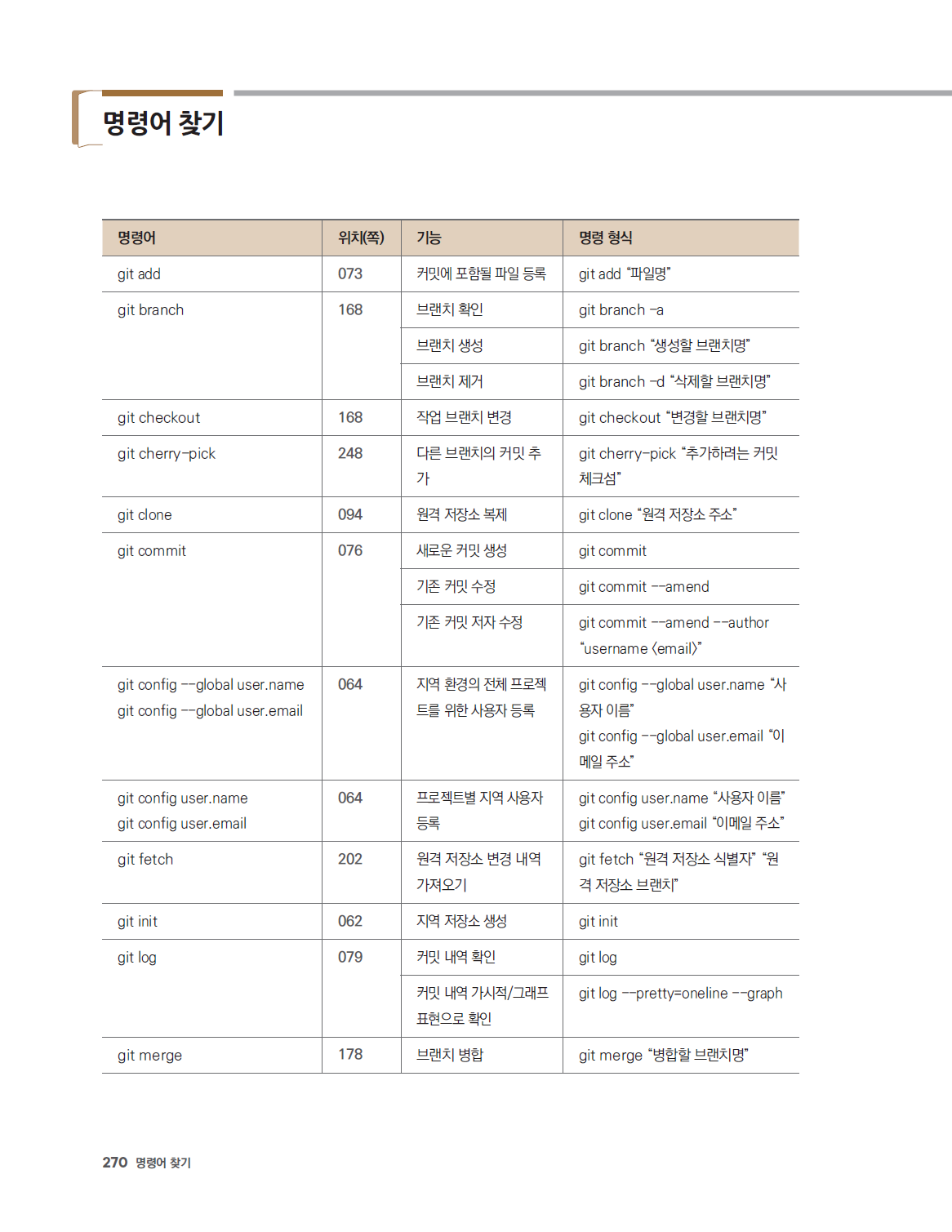 찾아보기(인덱스)는 해당 키워드와 다루는 페이지만 보여줍니다. 그런데 명령어라는 특성상 사용법을 곧바로 확인할 수 있게 구성했습니다. 이 역시 독자의 편의를 증대하고 시간을 아끼려는 노력이죠.