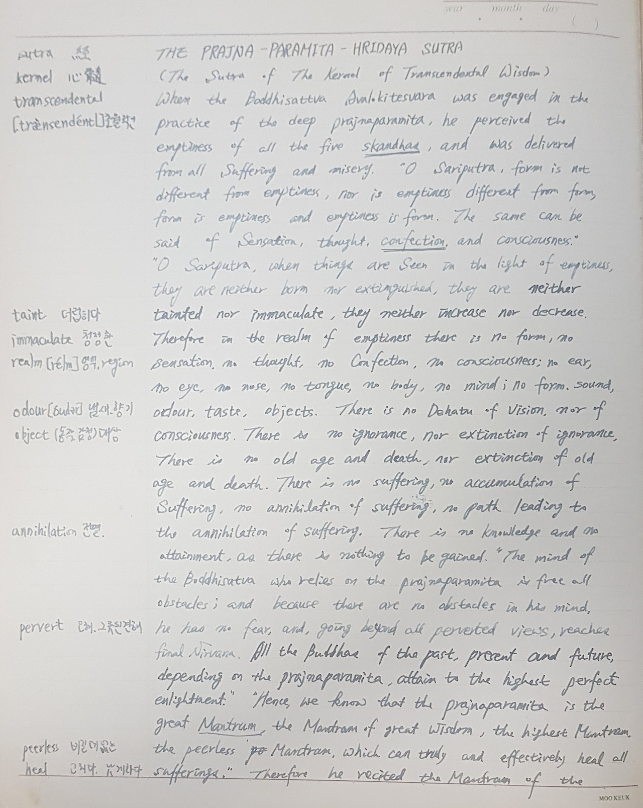 일기의 마지막 페이지에는 영문 ‘반야심경’을 베껴 써 놓았고, 한쪽 구석에 잘 모르는 단어 풀이를 해놓았다. 영문 경전을 읽는 것이 가끔은 경전 해석될 글을 보거나, 한문 경전을 읽는 것보다 이해가 쉬울 경우가 있다. 그 당시에 관심을 갖고 불교 공부를 열심히 했던 거 같다. 지금 돌이켜보니 겉으로만 공부한 느낌이다. 물론 하지 않은 것보다는 낫지만, 머리로 하는 불교 공부는 삶 속에 체화되지 않는 한 별 의미가 없다. 40년이 지나도 별로 변한 것이 없으니 그간의 공부는 모두 헛수고이다. 하지만 웃으며 이런 얘기를 할 수 있다는 것은 좋은 변화이다.