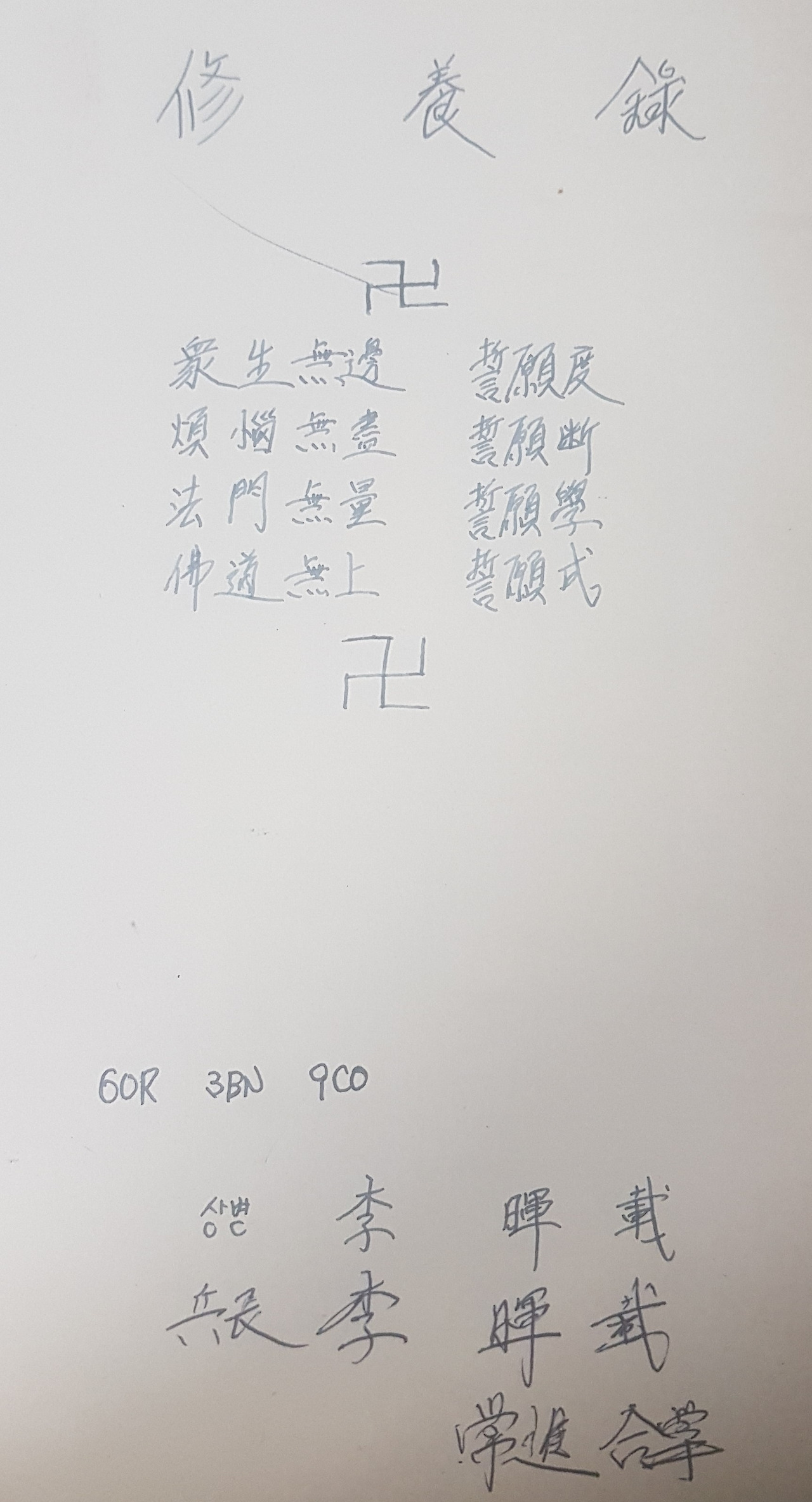 일기 맨 앞장에는 ‘수양록’이라고 쓰고 그 밑에 불교의 ‘卍’ 자 표시를 위아래로 적은 후, 그 안에 ‘사홍서원 (四弘誓願)’을 한자로 적어 놓았다. 사홍서원은 불자의 네 가지 큰 서원이다. 모든 중생을 구제하는 서원, 모든 번뇌를 끊어내겠다는 서원, 모든 불법을 공부하겠다는 서원, 불도를 이루겠다는 서원이다. 그 밑에 영어로 ‘60R 3BN 9CO’라고 써 놓았다. ‘60 연대, 3대대, 9중대’의 영문 표기다. 그리고 ‘상병 이휘재, 병장 이휘재’라고 썼고, 맨 아래에 상진 합장 (常進 合掌)이라고 써놓았다. 부대에서 처음 받은 법명(法名)이 상진이다. 1981년 9월 23일부터 시작해서 1982년 2월 15일까지 쓴 기록이다. 상병과 병장 시절에 쓴 일기로 제대 10일 전까지 썼다.