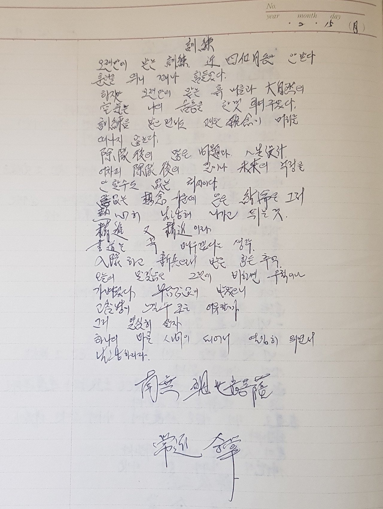 첫날 쓴 일기의 제목은 ‘막평 타인 부긍자기 (莫評他人 不矜自己)’다. 그 제목으로 미루어보아 못된 성격에 남에 대한 비난을 많이 했고, 열등감에 가득하여 못난 자기를 어지간히 자랑하려고 애썼던 거 같다. 그 당시 일개 소대원 30명 정도 중 대학 재학 중에 온 사람이 한 두 명에 불과했다. 일기에 한문을 많이 쓰고 가끔은 영어로 일기를 쓴 것으로 보아 어지간히 자신이 남과 다르다고 억지로 투쟁하듯 생활했던 거 같다. 열등감이 그런 식으로 표현됐던 거 같다. 지금 보니 너무 창피해서 얼굴이 화끈 달아오른다.