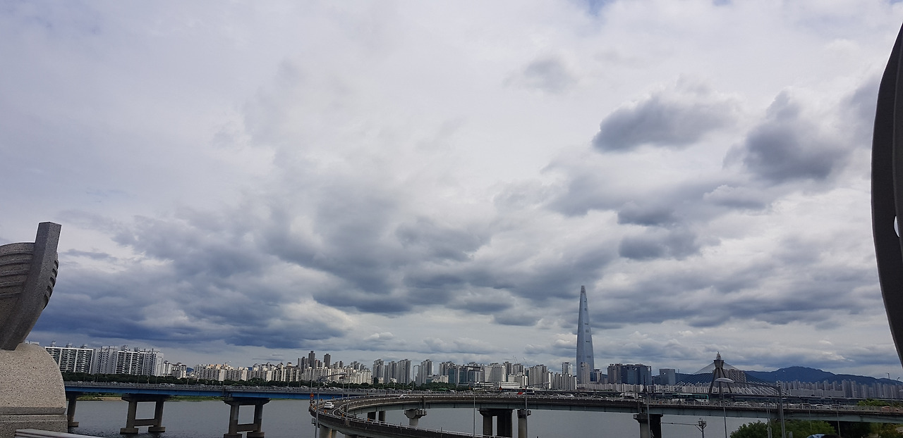 다행스럽게 구름이 많고 바람이 불어와서 더위를 심하게 느끼지 않고 편하게 걸을 수 있었다. 광진교에서 바라본 구름은 매우 인상적이다. 웅장하고 신비하고 하지만 쉽게 다가갈 수 없는 경외감도 느낄 수 있었다. 먹구름과 흰 구름과 회색 구름이 뒤섞여 수묵화를 그려낸 느낌이다. 시계가 좋아 멀리까지 볼 수 있고, 아차산의 능선이 광진교에서도 선명하게 보인다. 미세 먼지가 사라진 것이다. 걸으며 그런 풍경을 보는 것 자체가 주는 기쁨이 있다. 흙 길을 걷거나 산길을 걸으며 짙은 녹음 속 오솔길을 걷는 재미는 정말로 좋다. 이런 길은 밤새워 걸어도 지치지 않을 것 같다. 햇빛을 가릴 수 없는 길 양옆 가로수의 모습이 마치 우리를 환영하기 위해 도열하고 있는 의장대의 모습처럼 보이기도 한다. 어깨를 으쓱대며 기분 좋게 그 길을 걸어간다. 햇빛이 강하면 강할수록 우리는 더욱 힘을 내기도 한다.