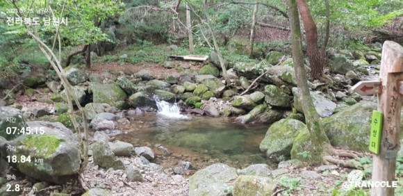 구인 월교를 지나 개천가를 따라 걷는다. 서너 명의 대학생들이 즐겁게 수다를 떨며 걷고 있다. 대학생들이 이 길을 걷는다는 것이 신기하고 대견스럽게 느껴진다. 개천가를 지나 오르막길이 시작된다. 마치 원시림에 들어온 착각이 들 정도로 깊은 산속을 걷고 있는 느낌이다. 깊은 숲과 적막함이 세상과 순간 단절된 분위기를 만들어 준다. 좁은 길이지만 잘 조성되어 있고, 오르막길의 돌계단은 분위기를 더욱 고풍스럽게 만든다. 길을 걷는 내내 만난 사람들이라곤 고작 다섯 명 정도에 불과하다. 덕분에 조용하고 한적하게 걸을 수 있었다. 자연스럽게 침묵 걷기가 된다. 홀로 이 길을 걸었다면 무서워서 중간에 포기할 수도 있을 것 같다는 생각도 들었다. 인적이 드문 길을 홀로 걷는 것이 점점 더 무섭게 느껴진다. 계곡에 유명 예능 프로그램을 촬영했다는 현수막이 보인다. 그곳을 찾아내어 예능 프로그램을 진행했던 사람들의 열정이 느껴지기도 하면서 동시에 당시의 사람과 활기가 없는 곳에 현수막만 달랑 걸려 있는 모습이 오히려 초라해 보인다. 굳이 그 현수막을 붙여놓을 필요가 있는지 물어보고 싶다. 나중에 들어보니 예능 프로그램 방영 후 많은 사람들이 이곳을 찾아왔다고 한다. 배너미재를 넘어 장항마을에 도착했다. 예약된 민박집에 들어갔다. 칠순 정도 되어 보이는 아주머님이 반갑게 맞이해 주신다. 요즘은 찾는 사람들이 거의 없어서 민박을 하지 않는데 우연히 우리 연락을 받고 손님을 받는다고 하신다. 길동무가 어렵사리 또 우연히 찾은 전화번호로 연락해서 예약을 하게 된 곳이다. 마음이 넉넉하고 따뜻한 인상이면서도 눈빛이 살아있다. 근처 원불교 교당에 다니며 공부를 하신다고 한다.