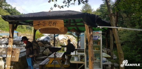 산길로 접어든다. 농작물 시범 사업단지가 저수지 옆에 있다. 보안 시스템이 잘 갖춰진 곳이다. 승용차 한 대가 지나가더니 입구에 서서 문을 열고 안으로 들어간다. 바로 경비 시스템에서 안내 및 경보 방송이 나온다. 산양삼 재배단지다. 길을 가파르지는 않지만 오르막길이 계속된다. 비록 넓은 임도이지만, 지루한 오르막길은 사람을 지치게 만든다. 드디어 정상에 올라 사진 한 컷 찍었다. 정상에서 바라본 지리산은 웅장하면서도 사람을 푸근하게 안아 주는 부드러움을 지니고 있다. 지리산은 마음을 편안하게 만들어 준다. 정상에서 내려오니 무인 판매대가 보인다. 무인 판매대는 신뢰를 바탕으로 운영된다는 점에서 괜히 마음이 동한다. 막걸리 한 병과 음료 한 병 마시며 통행세를 겸한 비용을 지불했다. 기분이 좋다. 무인 판매대가 더 많았었는데, 코로나로 사람들 방문이 줄어들어서 판매대도 닫은 곳이 많다고 한다. 괜히 안타깝다.