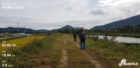 남원 인월센터에 도착해서 안내를 받고 스탬프도 받았다. 직원들이 매우 친절하다. 나이 드신 직원 한 분이 자발적으로 사진을 찍어주겠다고 하셔서 길동무들과 함께 센터 앞에서 인증사진을 찍었다. 산채 비빔밥이 먹고 싶다는 길동무 얘기를 듣고 직원에게 물어봤더니, 근처 맛있는 산채 비빔밥 집을 소개해주셨다. 식당에 들어가 비빔밥과 막걸리 한 병, 두부 한 모를 시켜 맛있는 식사를 마쳤다. 길동무 한 사람은 개인적인 일이 있어서 식사 후 서울로 올라간다. 헤어짐이 아쉽지만, 개인적으로 중요한 업무가 있는 친구를 잡아 둘 명분이 없다. 아쉬움을 커피숍에서 달랬다. 오랜만에 에스프레소를 한 잔 주문했다. 산티아고에서 길을 걸으며 카페에서 늘 마셨던 그 에스프레소의 쓰고 달착지근한 맛이 산티아고 길에 대한 향수를 불러일으킨다. 차를 마신 후 인월-금계 구간 시발점인 다리 앞에서 길동무와 허깅한 후 헤어졌다. 그 친구의 힘든 일들이 잘 정리되길 기원한다.