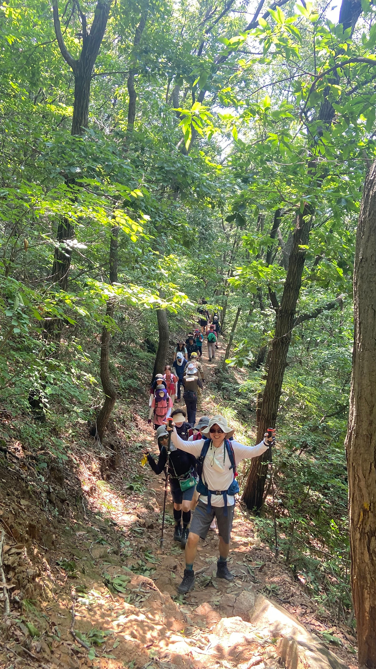 16명이 일렬종대로 숲길과 도로를 따라 걷는 모습이 마치 군인들이 행군하는 것처럼 보인다. 군대에서는 행군 훈련을 하며 월급을 받지만, 우리는 비용을 지불하며 즐겁게 걷는다. 군대에서는 하기 싫은 훈련을 억지로 하지만, 우리는 힘든 길을 기꺼이 걷는다. 그리고 보상으로 몸과 마음의 건강을 얻는다. 게다가 힘든 길을 마친 후 스스로 해 냈다는 자긍심도 느끼게 된다. 이 자긍심은 삶의 어떤 난관도 뚫어내고 앞으로 나아갈 수 있는 동력이 되기도 한다. 또한 함께 걸으며 길동무로서 동지 의식도 느낀다. 이 길은 혼자 걸으면 중간에 포기할 가능성이 높은 길이지만, 함께 걷기에 단 한 사람의 낙오도 없이 길을 마칠 수 있었다. 서로 격려하고 도움을 주고받고 의지했기에 가능한 일이다. 단 한 사람도 낙오하지 않고 모두 함께 완주해서 리더로서 너무 다행스럽고 고맙다. 산과 길이 우리를 힘들게 만들기도 하지만, 완주 후 뿌듯함과 자신감이라는 훈장을 선물해주기도 한다. 그 선물을 받으며 미소 짓는다. 직접 몸을 움직이고, 건강한 땀을 흘리고, 하고 싶은 일을 성취한 후의 미소는 삶의 모든 고뇌를 씻어 준다. 숨이 턱 막히는 무더위 속에서 길을 걸으면 일상 속 모든 어려움은 저절로 자취를 감춰버린다. 길을 걷는 힘듦 덕분에 일상 속 번민과 스트레스를 저절로 내려놓게 된다. 개인적인 경험에 의하면 두 시간 이상 힘들게 걸으면 머릿속 생각과 일상의 고민거리조차 들고 다니기가 귀찮아지기도 하고 무거워 저절로 내려놓게 된다. 그리고 그 힘듦은 보람과 자신감, 뿌듯함, 그리고 건강한 심신으로 보상해 준다.
