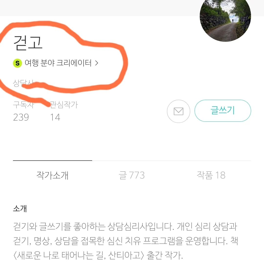 오늘 우연히 브런치 스토리를 보니 필명인 ‘걷고’ 아래에 ‘여행 분야 크리에이터’라는 문구가 보인다. 처음 보는 문구여서 검색해 보니 글을 꾸준히 쓰고, 구독자 수가 어느 정도 되고, 한 분야에 대한 내용을 꾸준히 올리는 작가들에게 이런 타이틀을 붙여준다고 한다. 2017년 산티아고 다녀온 후 책을 발간하게 되었고, 그 이후에 브런치 작가로 활동했으니 약 6년 정도 글을 쓰고 있다. 지금까지 쓴 글이 773편으로 매년 약 130편 정도의 글을 쓴 편이다. 통계적으로 보니 매주 2.5 편을 썼다. 바쁜 날이나 지방에 갈 때도 있고, 집안 일로 글을 쓰지 못한 것을 고려하면 주 3편 정도의 글을 쓴 것이다.
