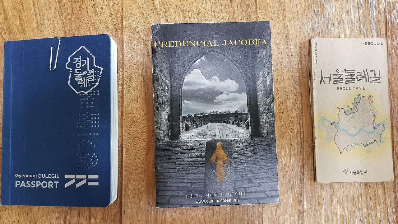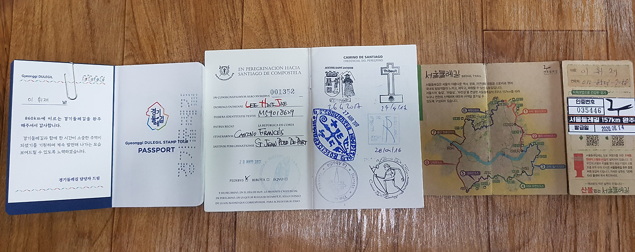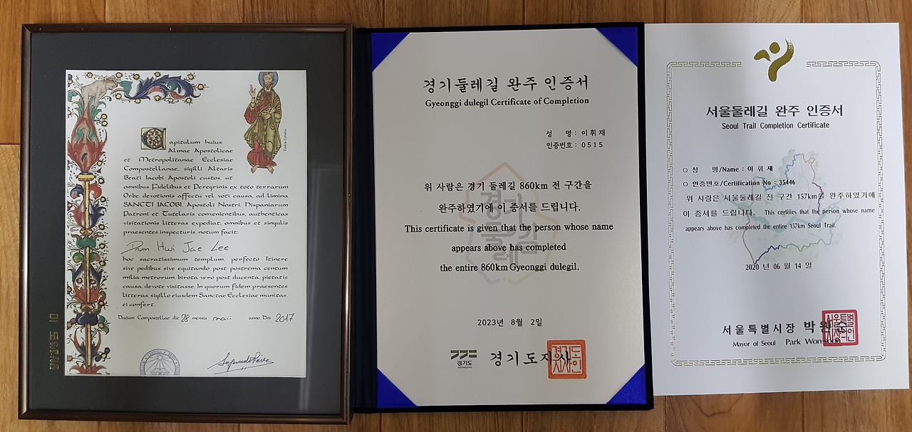 거실에 완보증과 기념품을 펼쳐서 사진을 찍었다. 그리고 이어서 산티아고 수첩, 완보증과 서울 둘레길 완보증을 함께 펼쳐놓고 사진을 찍었다. 산티아고를 제일 먼저 걸었고, 이어서 서울 둘레길을 걸었고, 마지막으로 경기 둘레길을 걸었다. 산티아고 920km, 서울 둘레길 157km, 경기 둘레길 860km를 걸었다. 요령 피우지 않고 너무 고지식하게 오직 내 두 발로 어깨에는 배낭을 메고 걸었다. 혼자 걸을 때도 있었고, 함께 걸을 때도 있었다.