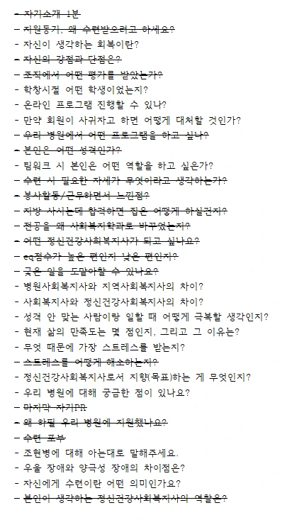 나는 매년 수련준비생이 실제로 받은 질문을 정리하는 블로그 <환자와의 대화>를 참고했다. 자료를 모두 읽었다면, 자기만의 '예상 질문 리스트'를 작성하고 연습하도록 한다. 이때, 질문의 의도를 파악하며 준비했다.
