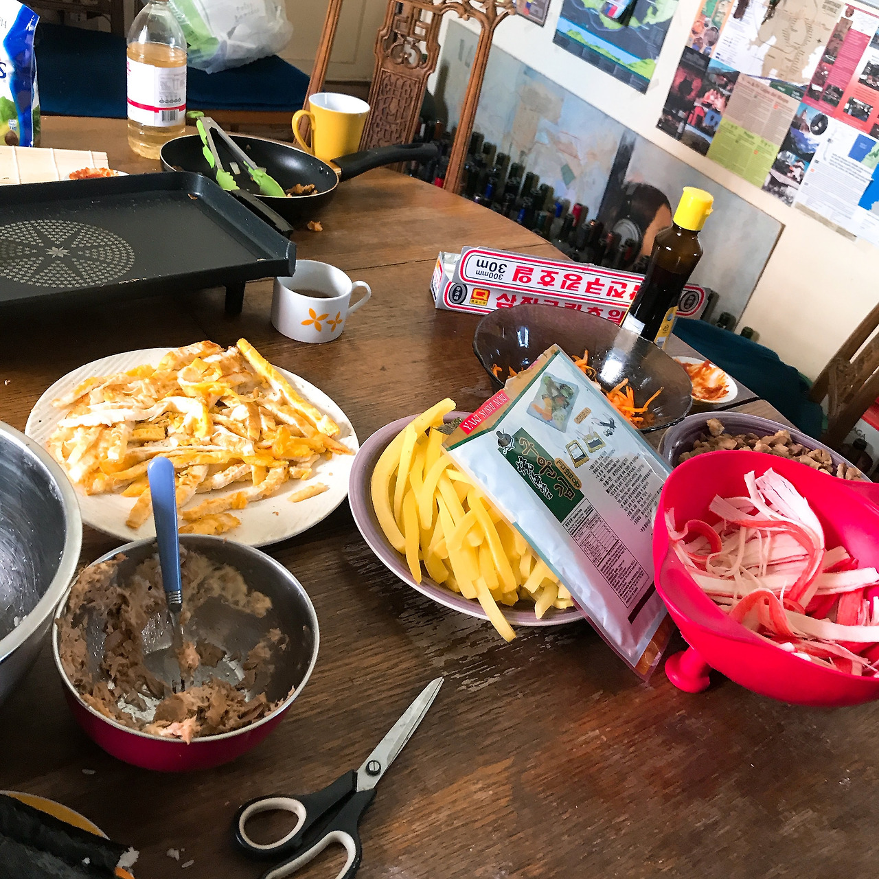 다행히도 그 소식을 들은 게스트하우스 사장님께서 남아있던 한국 쌀을 주셨다. 덕분에 감사히 김밥 약 50줄과 김치전 50장을 만들 수 있었다. 이런 우여곡절 끝에 우리는 판매시간으로 공지했던 12시를 훌쩍 넘어 3시가 다 돼서야 준비를 마칠 수 있었다.