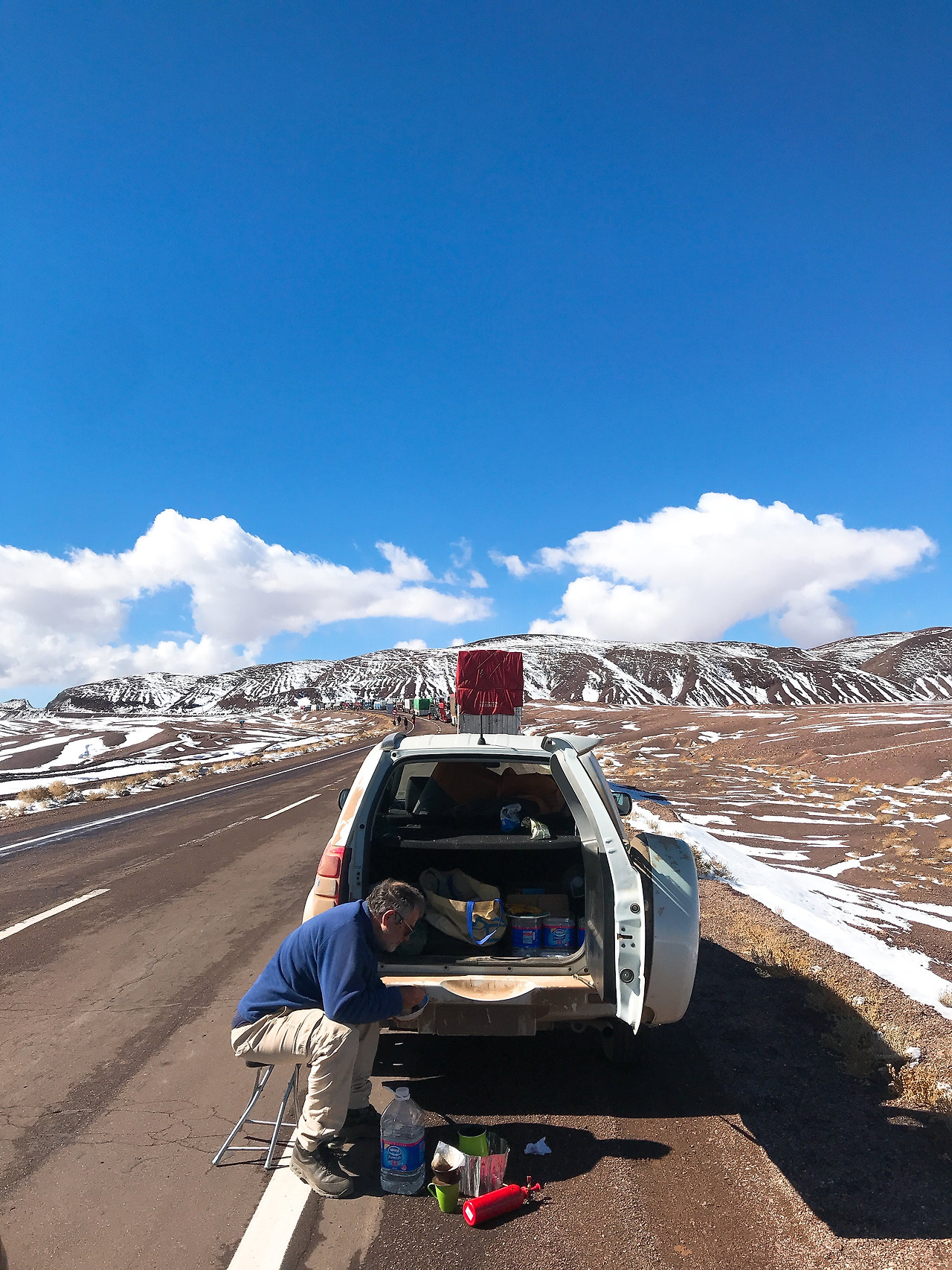 차에서 왜 내리라고 했나 보니, 눈길에 차가 지나가지 못해서 눈이 좀 녹을 때까지 기다리면서 사진 찍으며 놀자고 한다. 그도 그럴 것이 산티아고에서 진눈깨비만 내려도 온 칠레 사람들이 나와 눈을 구경하는데, 가뜩이나 비나 눈이 안 온다는 이 지방 사람들에겐 밤하늘에 매일 떠있는 수많은 별보다 눈 덮인 풍경이 필시 귀한 광경 일 것이다.