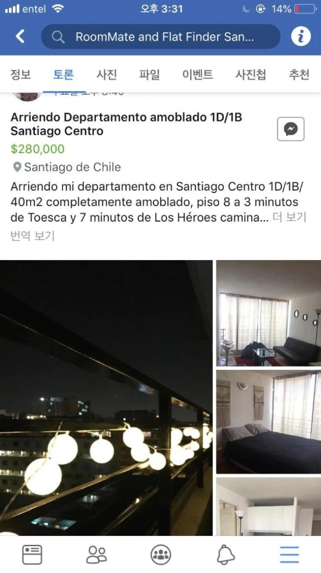 싸고 좋은 조건의 집들은 올라오자마자 바로 나가므로, 처음에 여유롭게 확인하다가 몇몇 좋은 조건의 집 들을 놓쳤다. 그 후 며칠을 알람을 설정하고 주기적으로 매물을 확인한 끝에 맘에 드는 집을 예약할 수 있었다. 회사에 휴가를 쓰고, 하루 날을 잡아 Tobalaba역 근처에 올라온 칠레 친구 집을 방문하기로 했다.