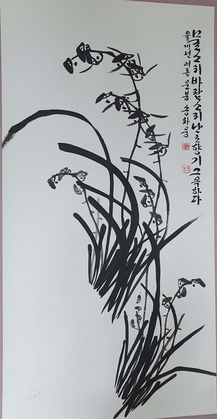 문인화를 그리려면 먼저 선생님에게서 체본(體本)을 받는다. 그리고 일 년 동안 체본대로 따라서 그린다. 내가 처음 받은 체본은 난초였다. 일반적인 난초는 왼쪽에서 오른쪽으로 그리는데, 왼쪽으로 향한 난초를 주시면서 그리라고 했다. 일 년을 꼬박 난초만 그렸다. 전지(70cm X 135cm)로 300장은 넉넉히 그렸을 것이다. 처음 그린 난초를 다시 보면, 그림은 잘 그려져 있는데 플라스틱 판때기를 오려 붙인 것 같다. 먹의 농담이 제대로 되어 있지 않아 부드럽지가 못하고 딱딱하다. 그렇다고 힘이 있는 것도 아니다. 대원군의 난초는 문인화를 하는 사람뿐 아니라 붓을 들어본 사람은 다 안다. 그렇게 유명한 대원군도 평생 동안 난을 쳤다고 한다. 나는 이제 그 난초 그림의 입구에 와 있을 뿐인데, 서두를 필요가 어디 있겠나?