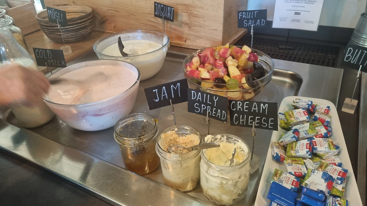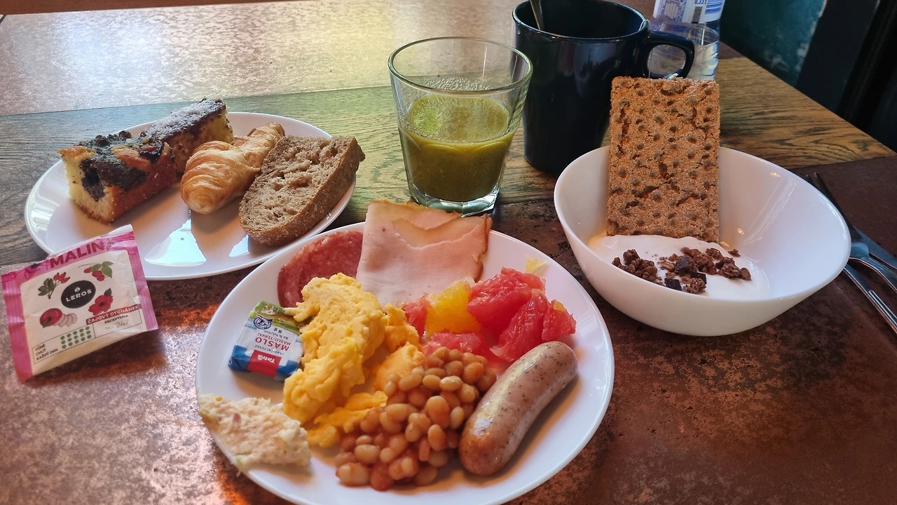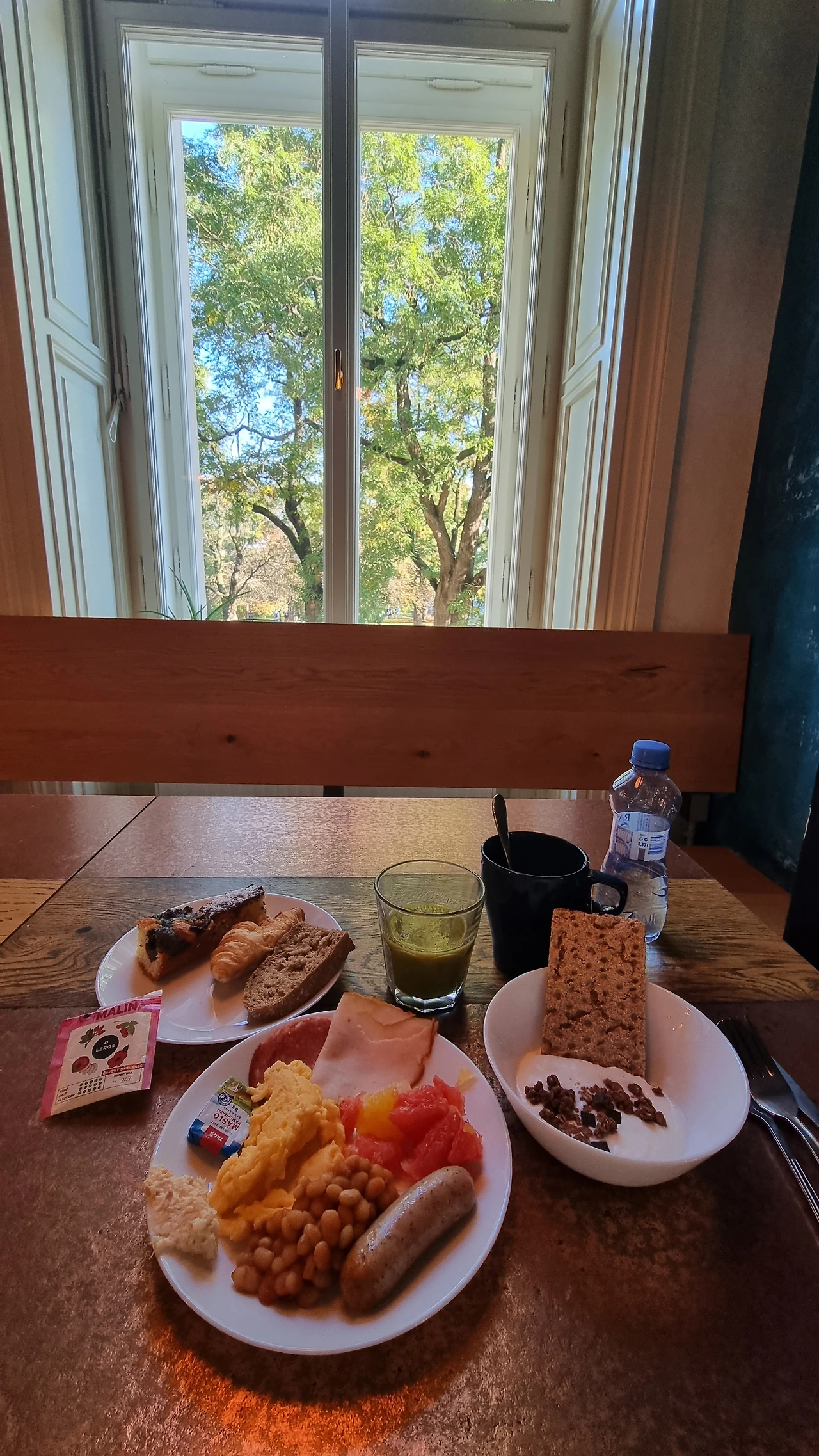호스텔 조식은 15,000원인데 요즘 한국도 물가가 많이 올라서 이 정도 가격에 빵 따뜻한 차 요거트 뮤즐리 햄 치즈 소세지 계란 스크램블 포리지(서양식 죽) 스무디 팬케이크 디저트까지 양껏 먹을 수 있으니 괜찮은 듯. 따뜻한 국물이 그립지만 차 한잔으로 대신해야겠다. 여기는 차를 줄 때 항상 레몬과 꿀을 같이 준다. 그리고 인상 깊었던 점은 비건용 음식을 명확하게 표기하고, 스무디 조차 우유 넣은 것/ 안 넣은 것으로 선택권을 준다. 나처럼 우유 먹으면 배 아픈 유당불내증 까지 배려해주니까 참 고마운 식탁의 배려가 느껴진다.
