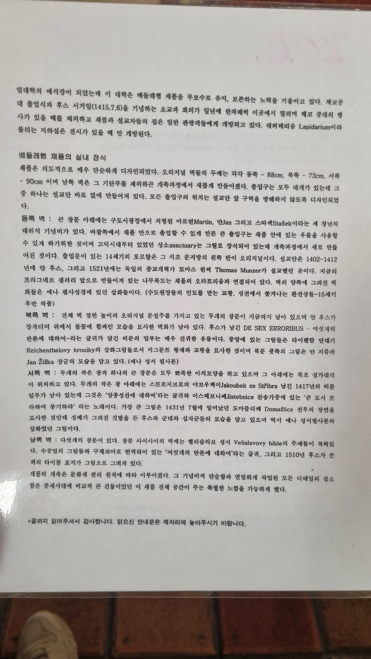 이 공간에서 드려졌던 예배, 얀 후스가 온 마음을 다해 전했던 하나님의 진짜 사랑, 모든 사람이 주 안에서 평등하다 말로만 그친 것이 아니라 누구든지 진리가 담긴 성경 말씀을 읽을 수 있게 했던 체코어 성경 집필의 행보를 가만히 되짚어 보았다.