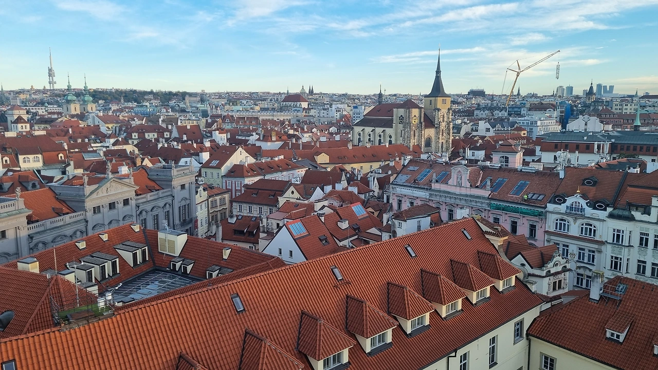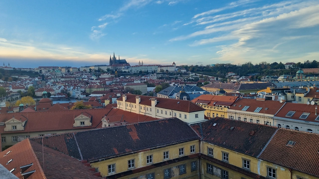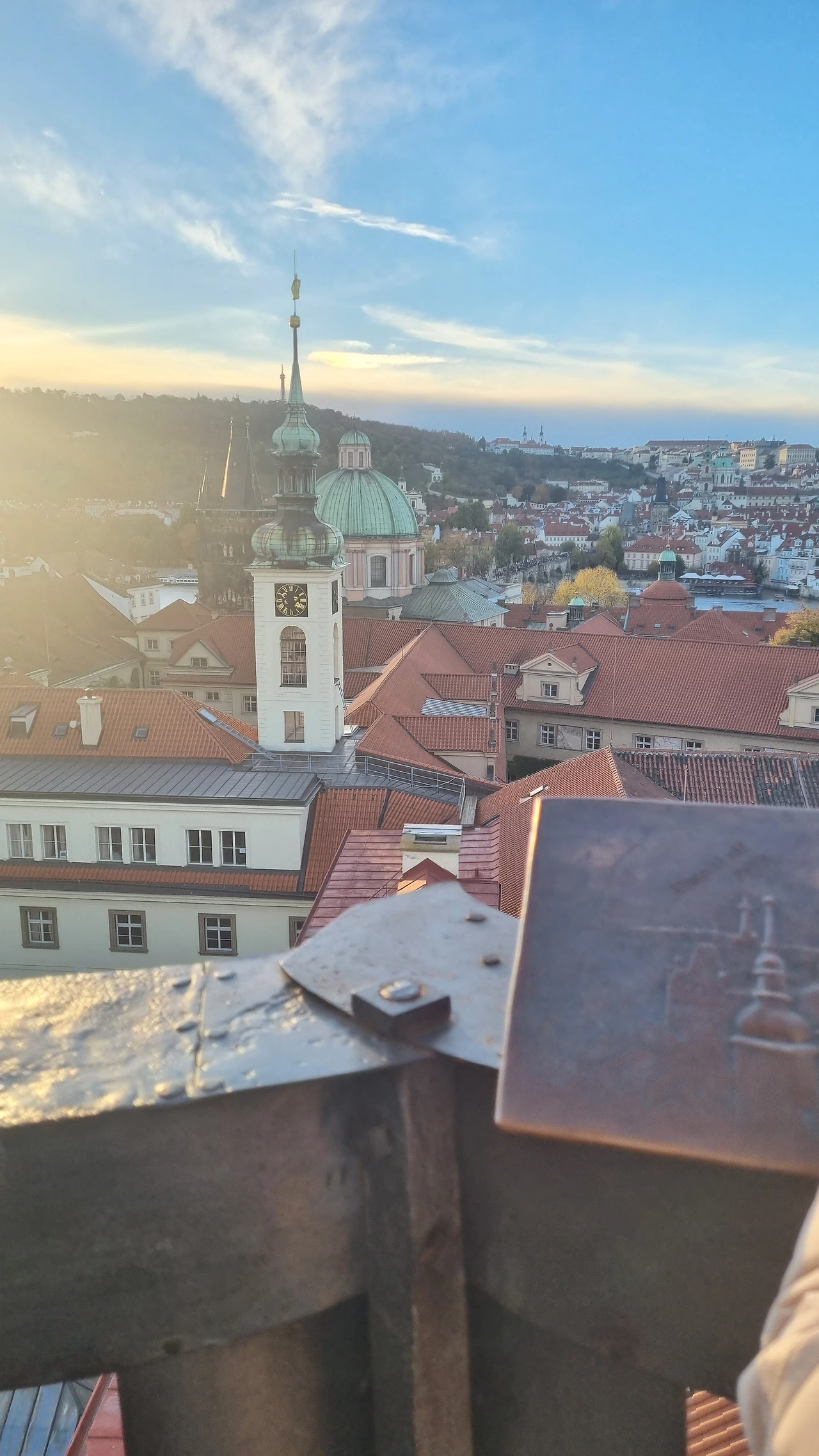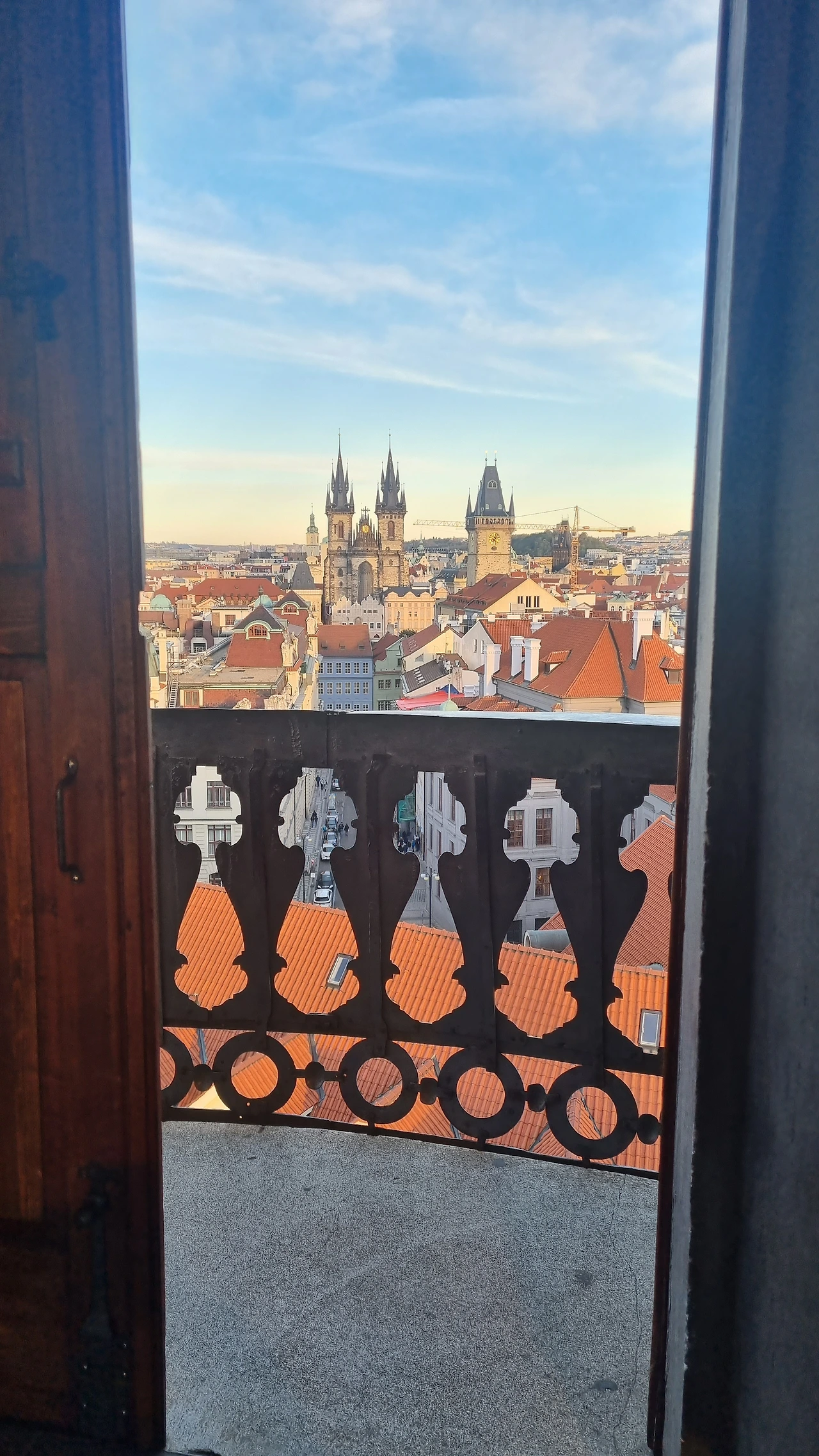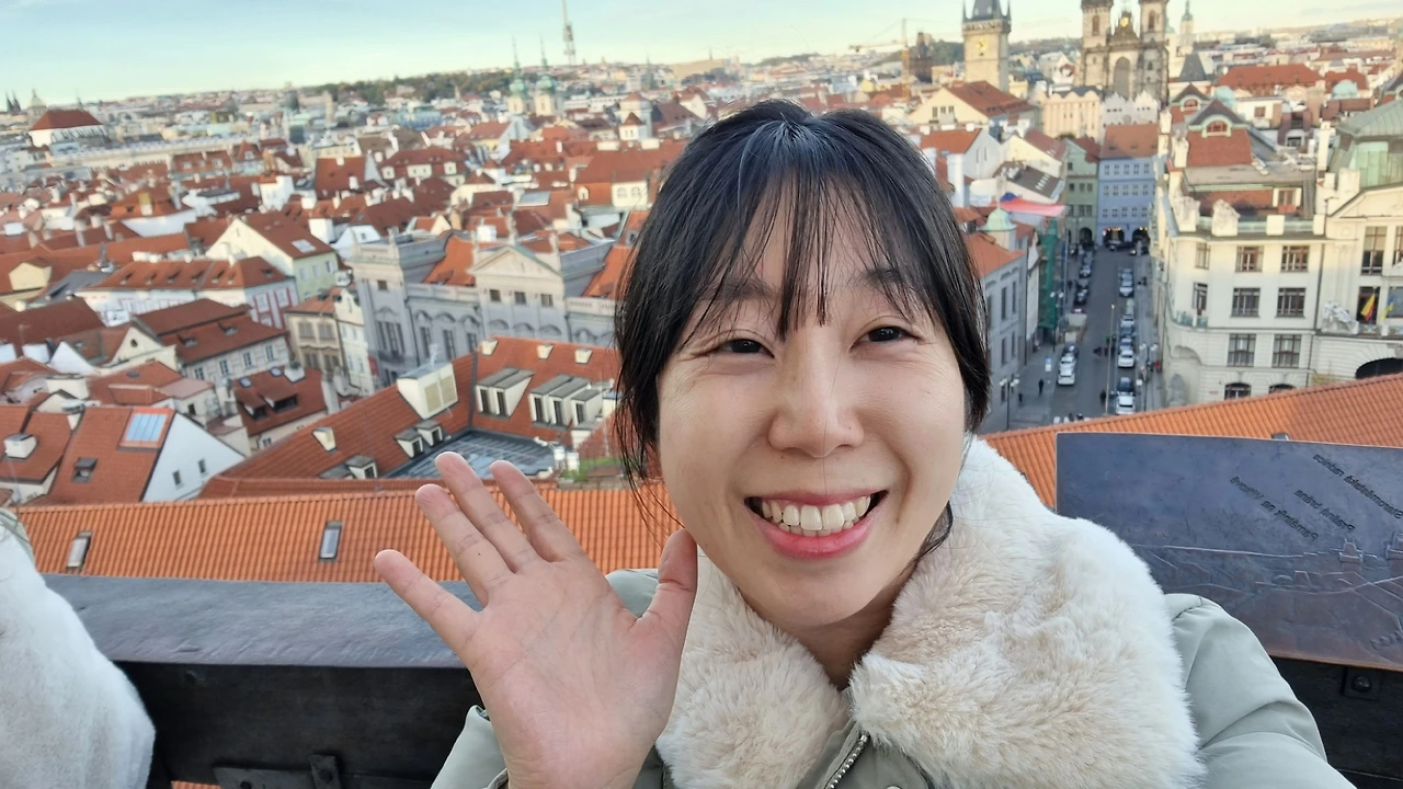 가이드 분의 설명이 끝나고 옥상 같은 공간으로 우리를 올려보냈다. 성 꼭 대기 올라온 것처럼 프라하 시내가 한 눈에 들어오는 파노라마뷰가 펼쳐졌다! 이런 곳이면 기상 관측 할 만하네. 붉은 빛을 띄는 갈색 지붕들이 오밀조밀 모여 있다가 간혹 거대한 성당과 탑들이 점점이 박혀 있고. 탄성이 저절로 나왔다. 다들 신나게 사진들을 찍으신다. 나는 찍어줄 사람이 없으니 짧은 팔을 뻗어 셀피만 찍어본다. 다른 사람에게 부탁해도 되긴 한데 폰 분실에 대한 두려움 때문에 잘 못 맡기겠다.