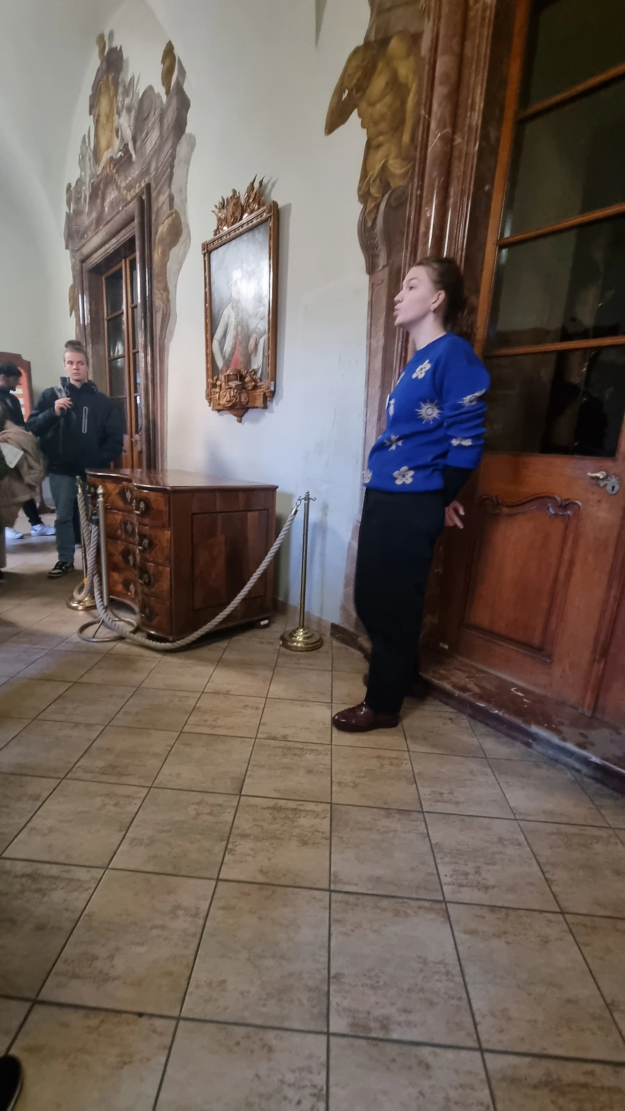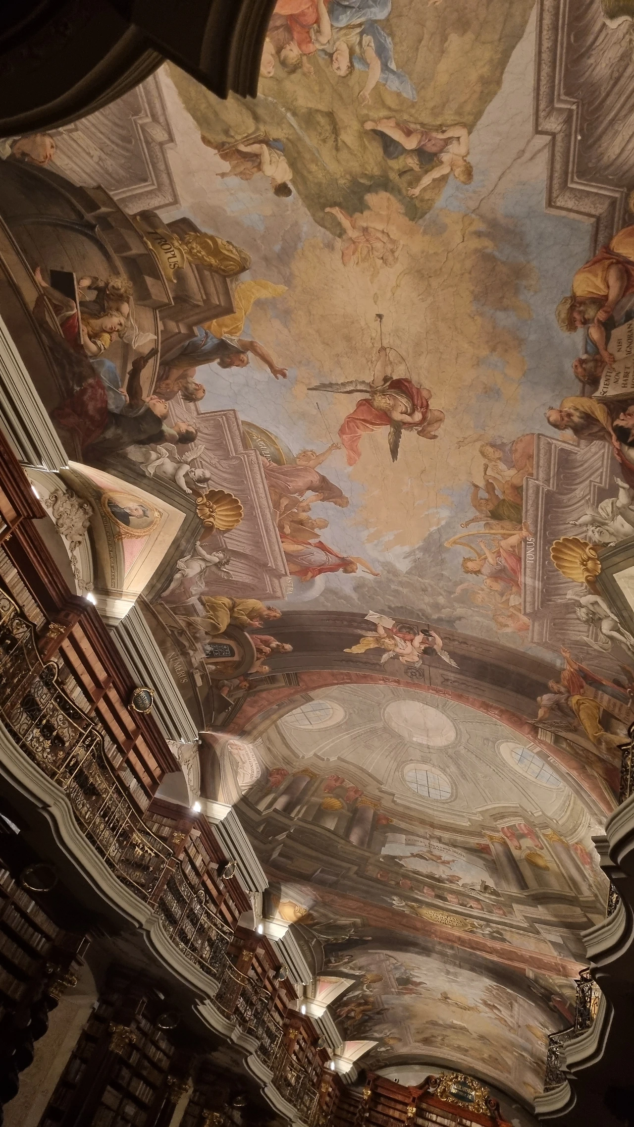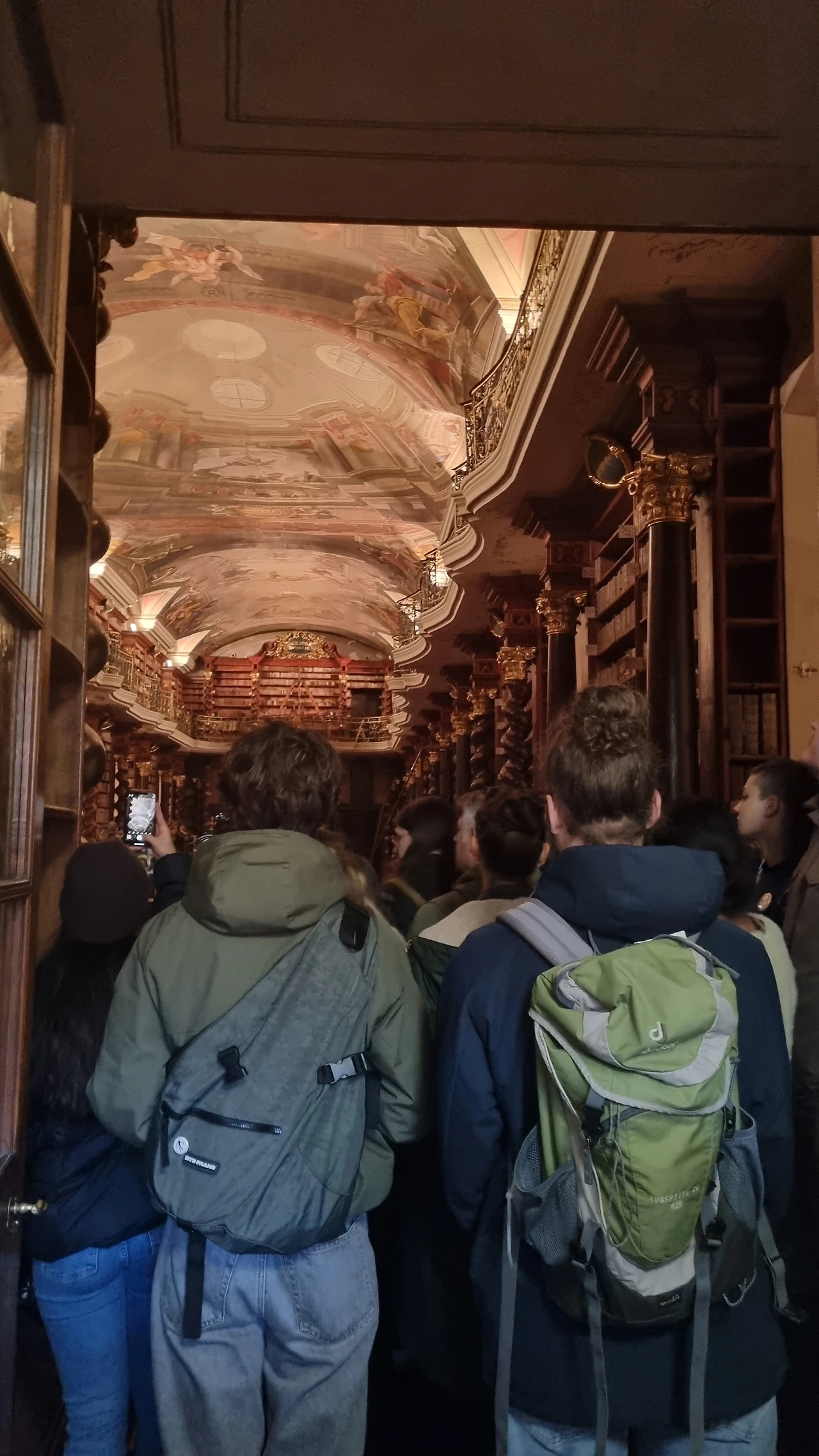 클레멘티눔이란 얀 후스를 따르던 후스파 세력을 견제하기 위해서 로마 가톨릭 쪽에서 예수교를 끌어들여 신학교와 도서관과 여러 문화 공간을 만든 거였단다. 그러니까 체코 버전의 복합문화교육공간 정도 되지 않을까. 우리는 가이드 선생님을 따라 좁은 계단을 계속 올라갔다. 고대하던 그 도서관 공간 앞에 섰는데 문이 굳게 닫혀 있었고, 딱 15분 정도만 오픈해줄 것이며 워낙 오래된 고서들(19세기)과 가구, 천장 프레스코 그림들을 보존해야 하기 때문에 세이프 라인 까지만 들어갈 수 있다고 했다.