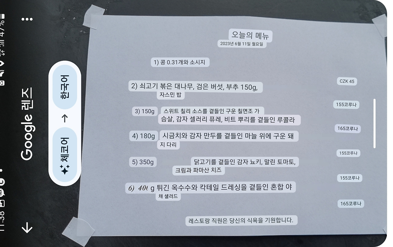 점심을 먹으러 온 식당에 오늘의 정식이 있어서 감자퓌레와 칠리소스 곁들인 칠면조 가슴살 요리를 먹었다. 맛있어서 깜짝 가격 싸서 또 깜짝.(9천원 대)