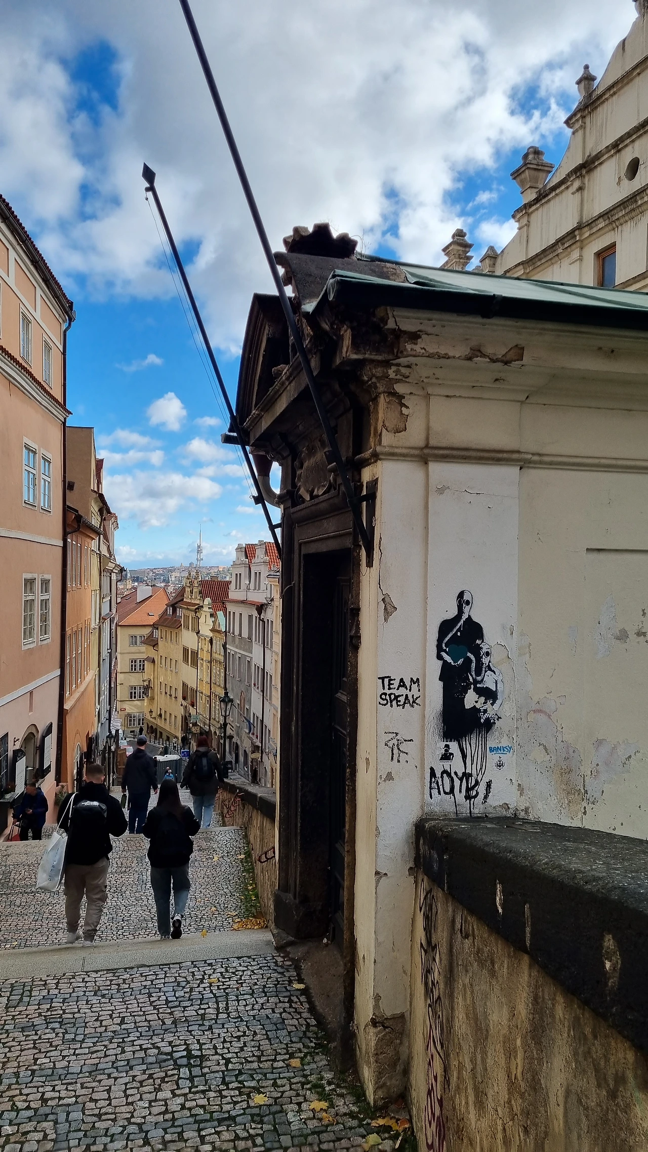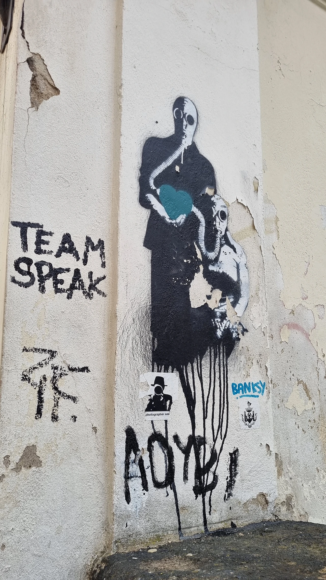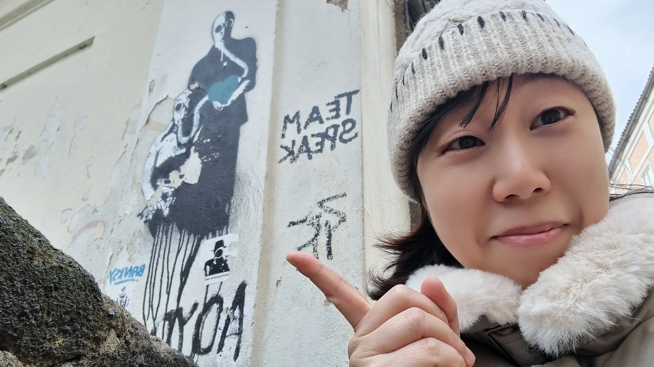 단풍놀이를 실컷 즐기고 내려오는 계단에서 우연히 뱅크시의 작품을 발견했다! 뱅크시는 세계 곳곳의 벽이나 건물 외벽 등에 의미있는 메세지를 담아서 그림을 그리는 것으로 유명한 스트리트 아트 작가다. 게릴라처럼 이곳 젃에 그림을 남기는 데 이 사람이 그림을 그리면 볼품없던 공간도 천정부지로 값이 치솟는단다. 예상하지 못한 곳에서 만나니 선물 받은 기분이다.