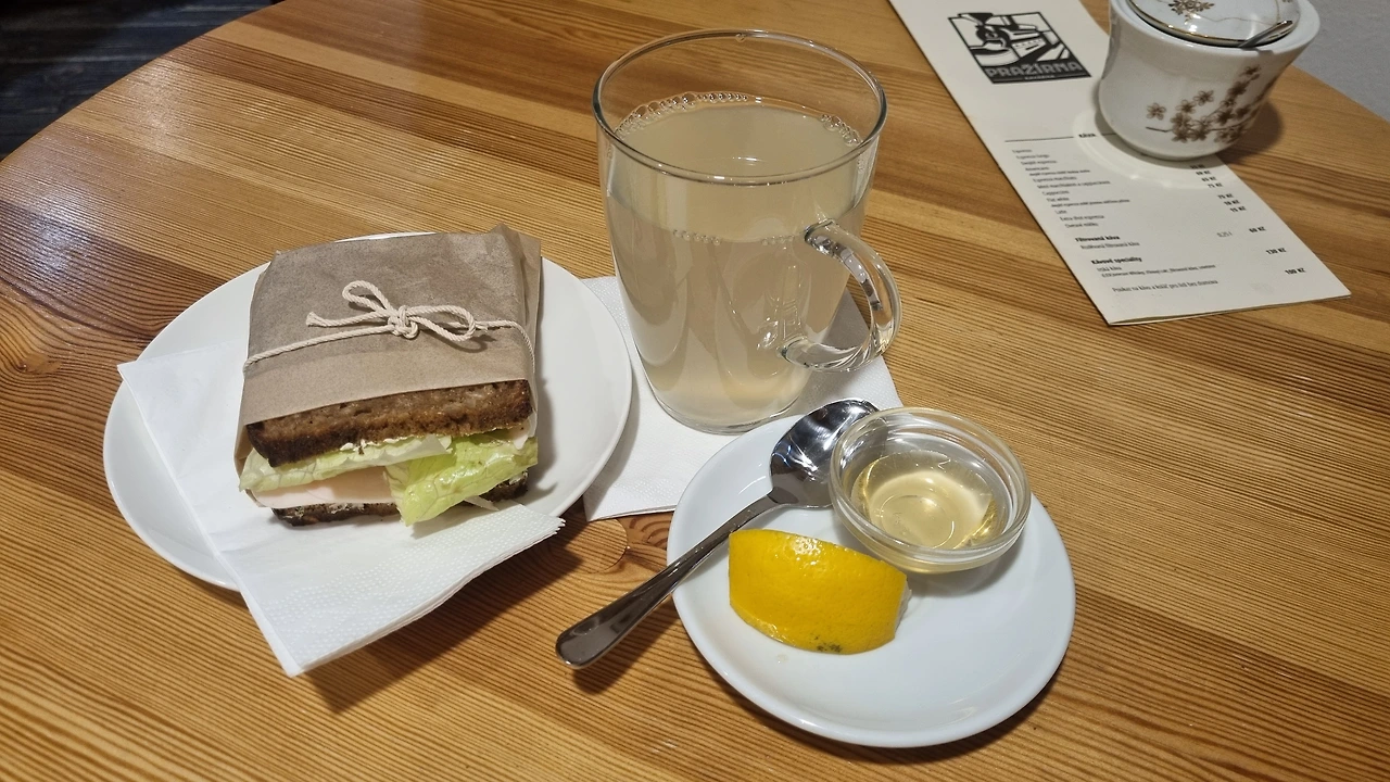 아침만 되면 배꼽시계가 울리니, 구글 평점이 높은 주변 카페를 찾아갔다. 반지하에 위치한 귀여운 카페에 들어서니 여기도 벽돌로 만든 동굴 느낌. 작가들의 그림 전시도 함께 하고 있나보다. 프라하는 화려한 작품이 아니더라도 어디에서나 소소한 예술의 영감을 만날 수 있어서 좋다. 샌드위치와 홈메이드 진저티(생강차)를 먹는데 우리나라 생강보단 좀 맵기가 약하지만 따땃하니 몸에 힘이 생긴다.