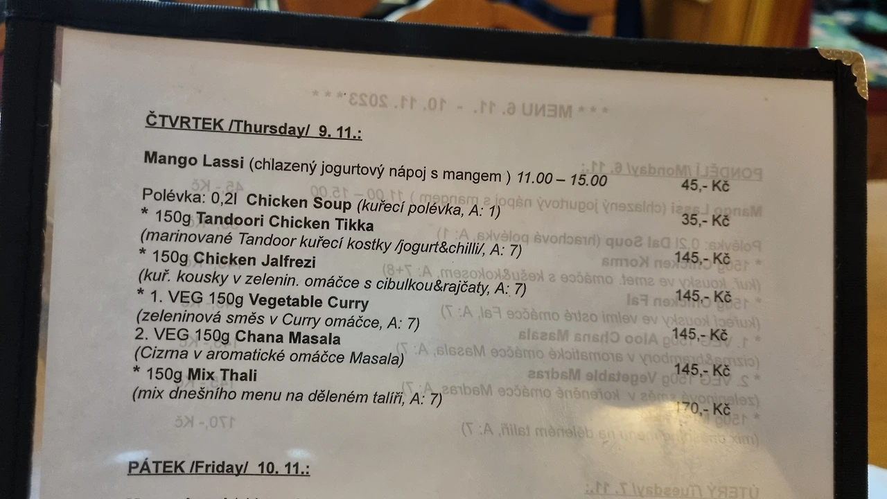 브르노 식당을 검색했을 때 한국인들의 극찬이 쏟아지던 커리 식당으로 갔다. 들어서자마자 눈이 마주친 사장아저씨께서는 인도 분 같아보이셨는데, 마치 난 니가 여기 찾아올 줄 3천년 전부터 알고 있었다는 느낌으로 나를 3초간 응시하신 후 고개를 끄덕이며 마음에 드는 어디든 앉으라는 제스처를 보이셨다. 요일마다 그날의 메뉴가 있었는데, 그 메뉴 3개를 한 꺼번에 다 담아주는 메뉴가 있어서 당연히 그걸 골랐다. 심지어 만원도 안 된다!