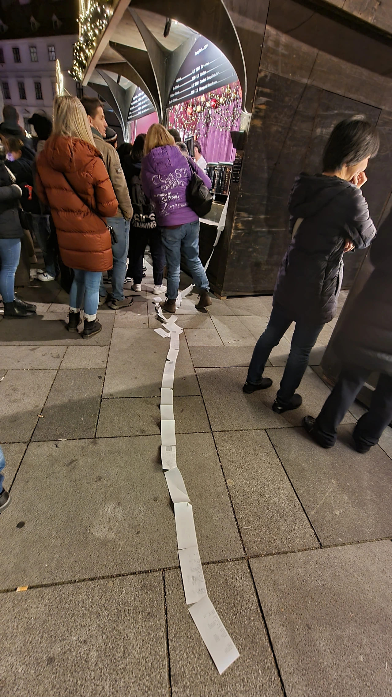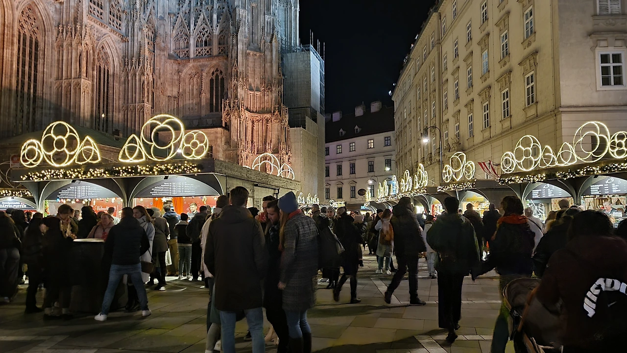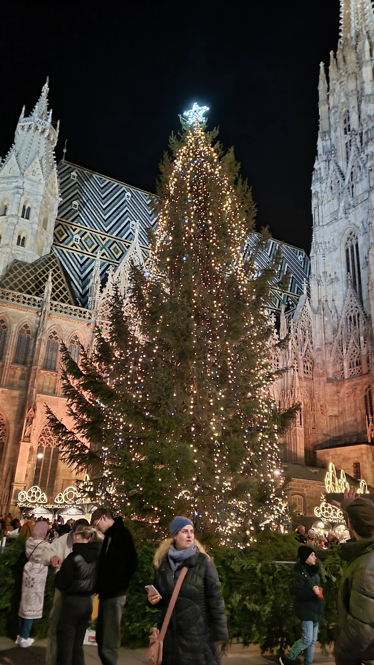 내가 안 가본 지역의 크리스마스 마켓도 구경해보자 싶어서 핫도그 소중히 품고 슈테판 성당 앞으로 왔다. 지구 천장을 찌를 듯 높다란 고딕 양식 성당 앞에도 예쁜 불빛의 크리스마스 마켓들이 반짝거린다.