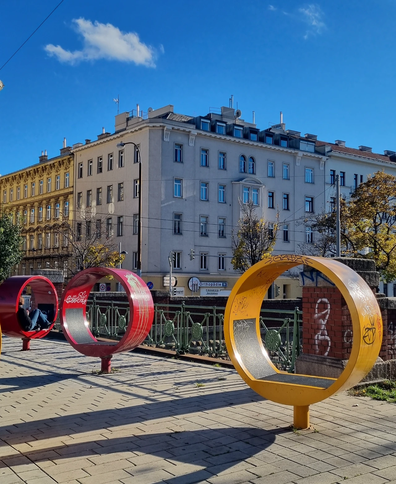 감사 인사를 드리고 200% 충전된 몸으로 오늘의 여행 시작, 한국에서 미리 예매해둔 뮤지컬 레베카를 보러 간다. 멋진 스트리트 아트 작품들, 동그라미 벤치들을 구경하며 걷다보니 라이문트 극장에 도착. 낮 공연은 처음이고 과연 독일어 뮤지컬 + 영어 자막으로 잘 감상할 수 있을지 모르겠다. 뮤지컬 박사인 대학 동기가 보내준 자료로 줄거리와 내용은 미리 익혀놨다.