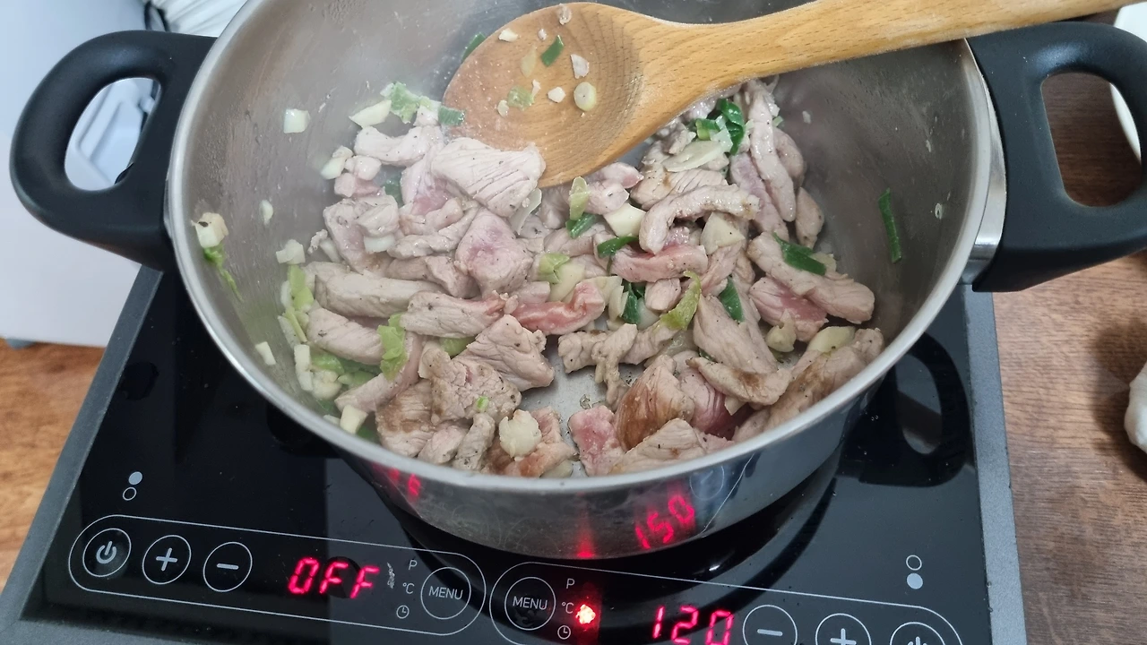 고기 먼저 볶은 다음 나의 사랑 너의 사랑 고추장과 물, 야채 투여하고 바글바글 끓였더니