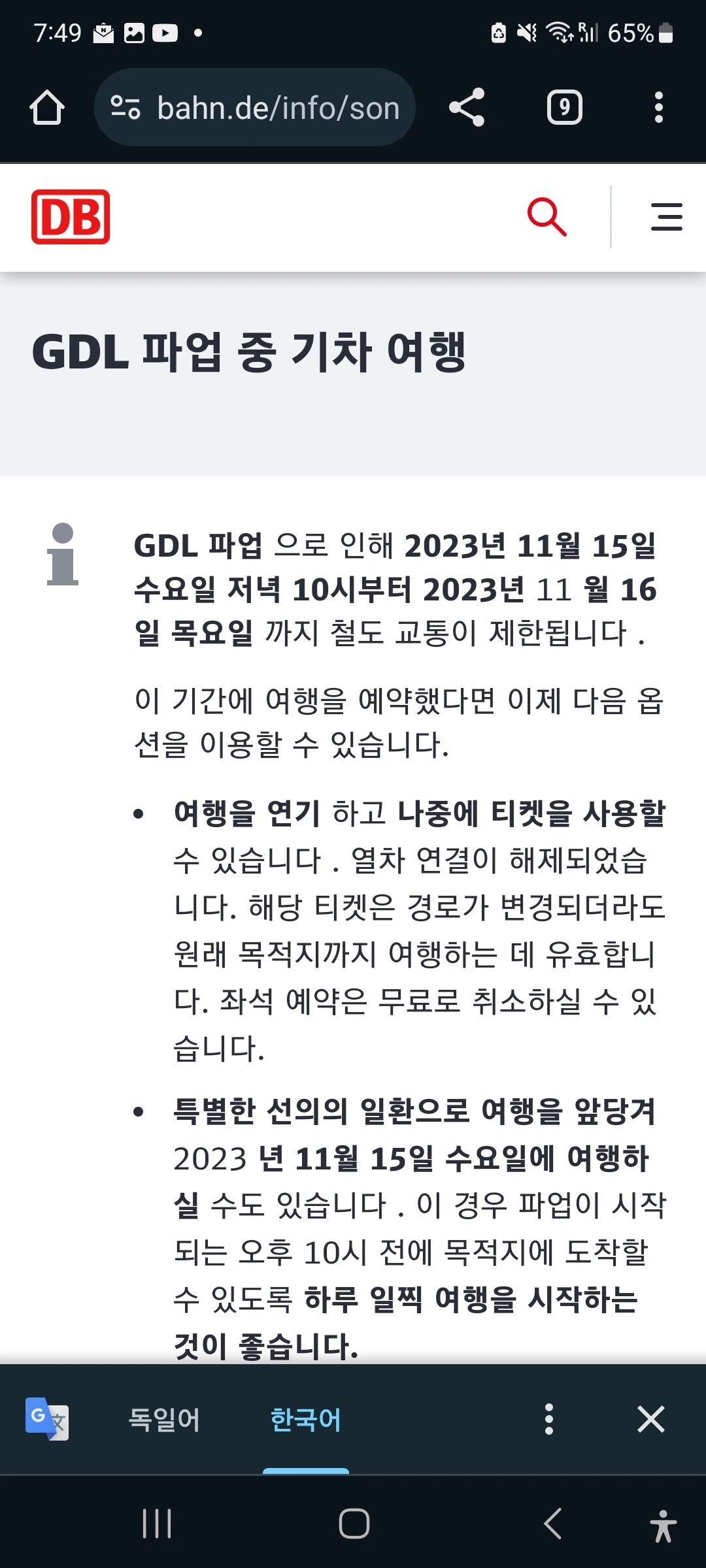 아...독일 철도청 악명 높다더니 내 여행에 이렇게 초를 칠 줄이야. 이틀 후 타보르에서 독일 드레스덴으로 기차를 타고 가려고 독일 열차 도이체반을 예약해뒀는데 독일 철도청에서 딱 그날 파업이라 내 예약편도 아예 없어질 수 있다는 경고 메일이다. 휴...일단 너무 졸리니 내일 아침에 해결하도록 하자.